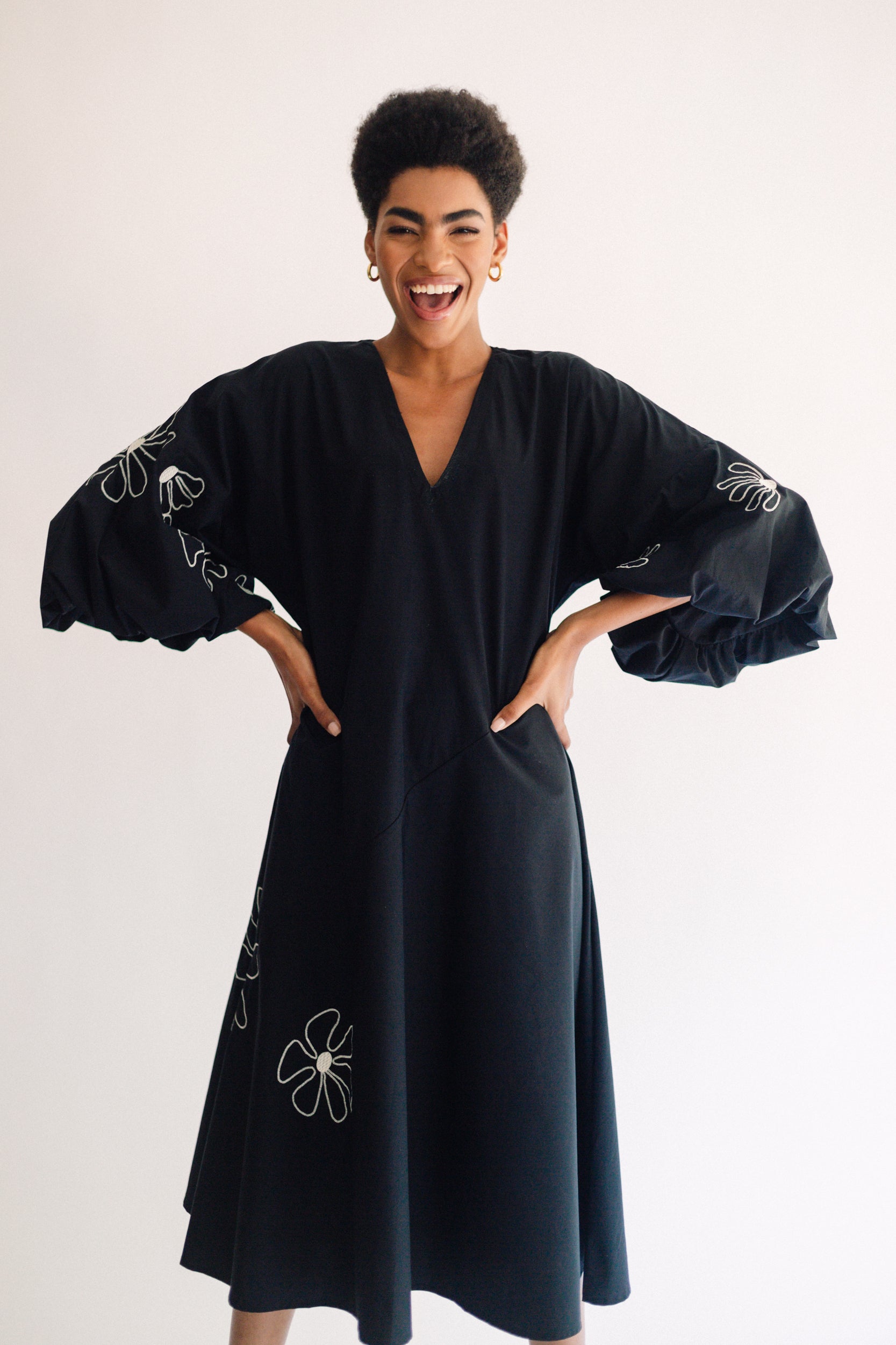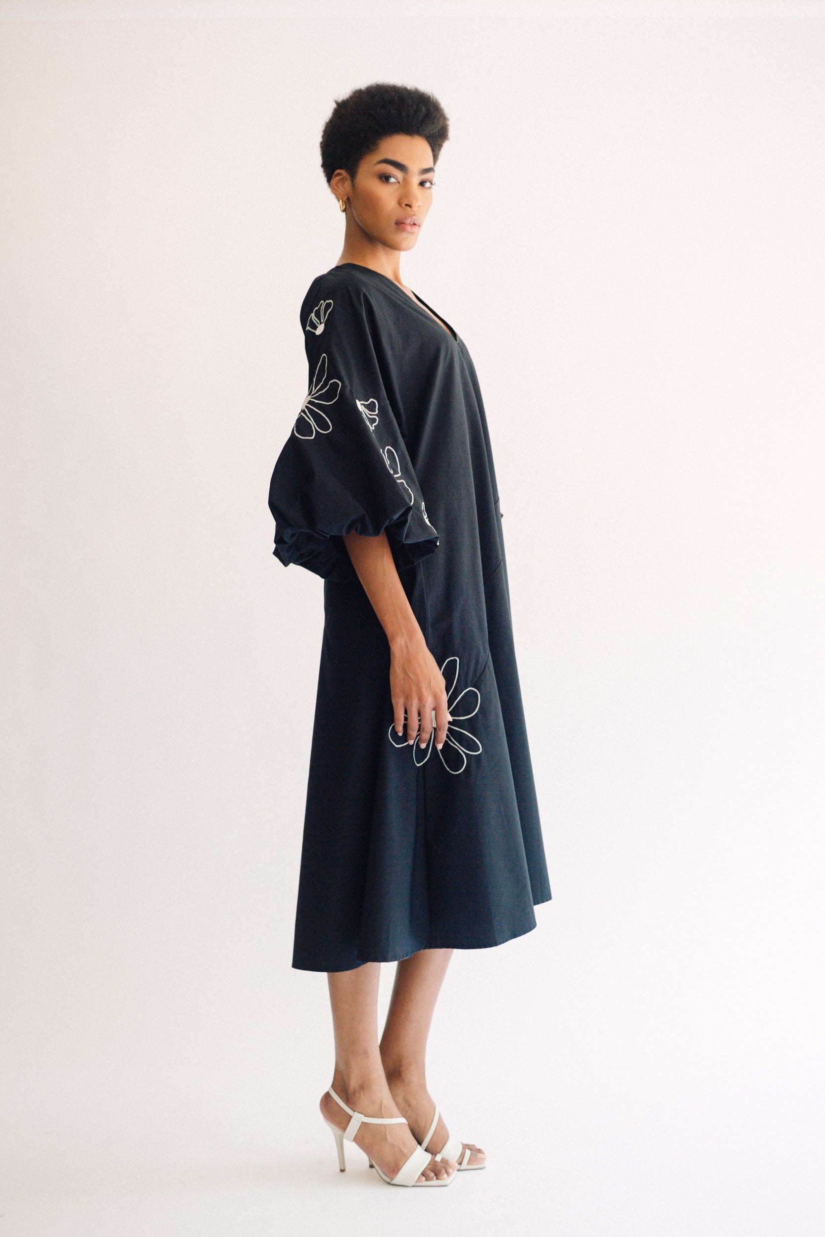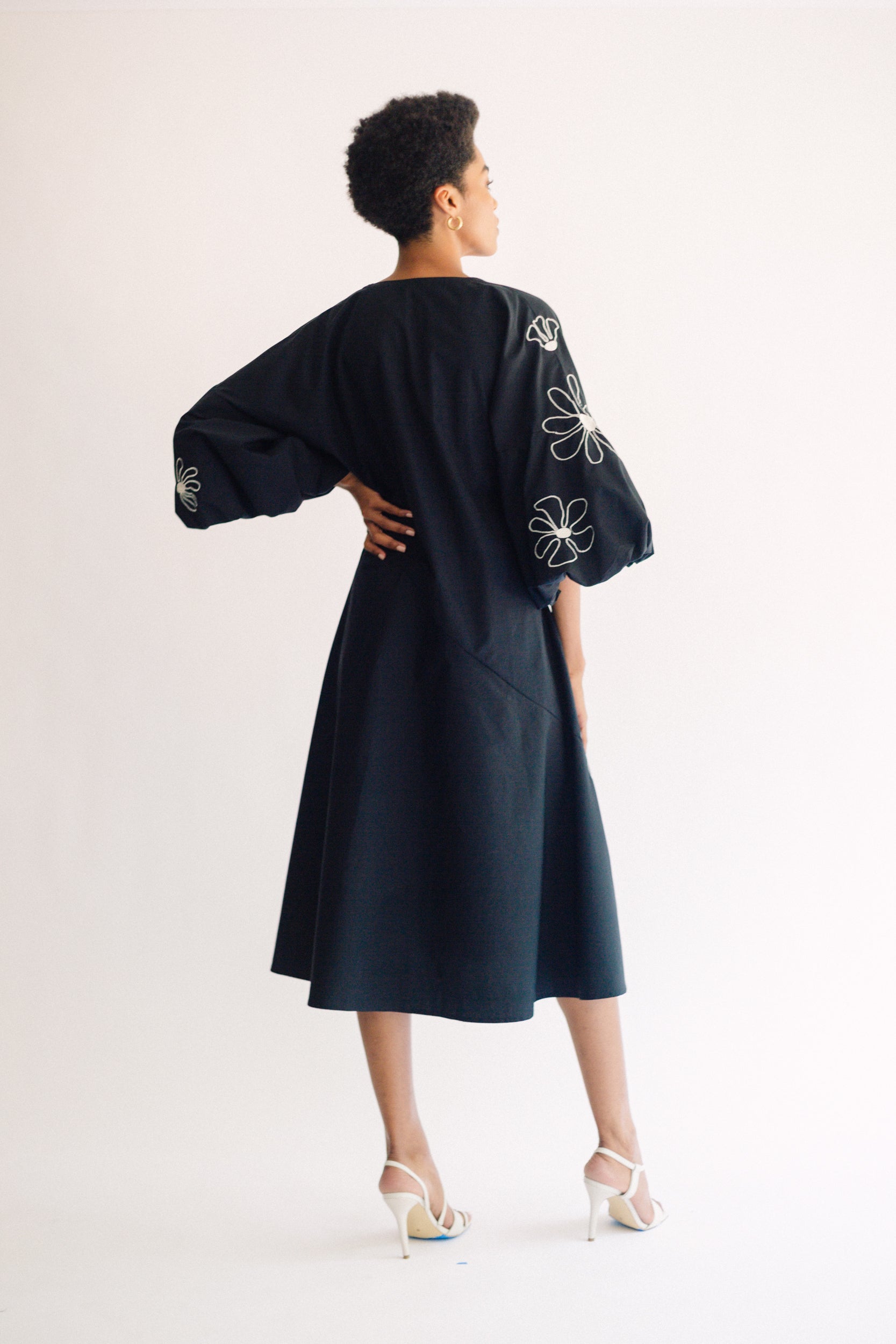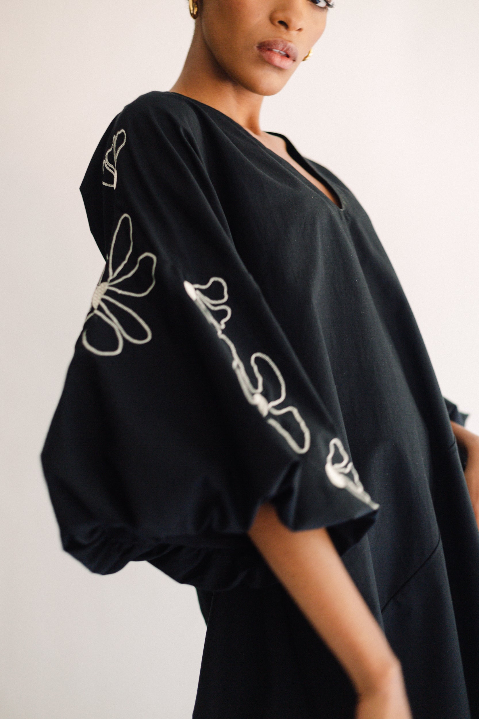 A celebration of artistry, this open A-line dress features a diagonal cut to enhance the elegance of its movement. While the classic V-neckline is imbued with understated beauty, the oversized puff sleeves and floral embroidery bring a boldness of form. More than just a dress, it’s a canvas for your mantra to be shared with the world.
