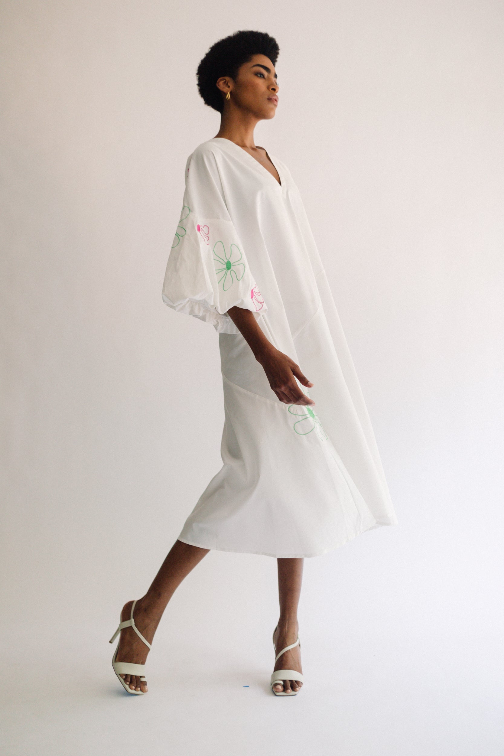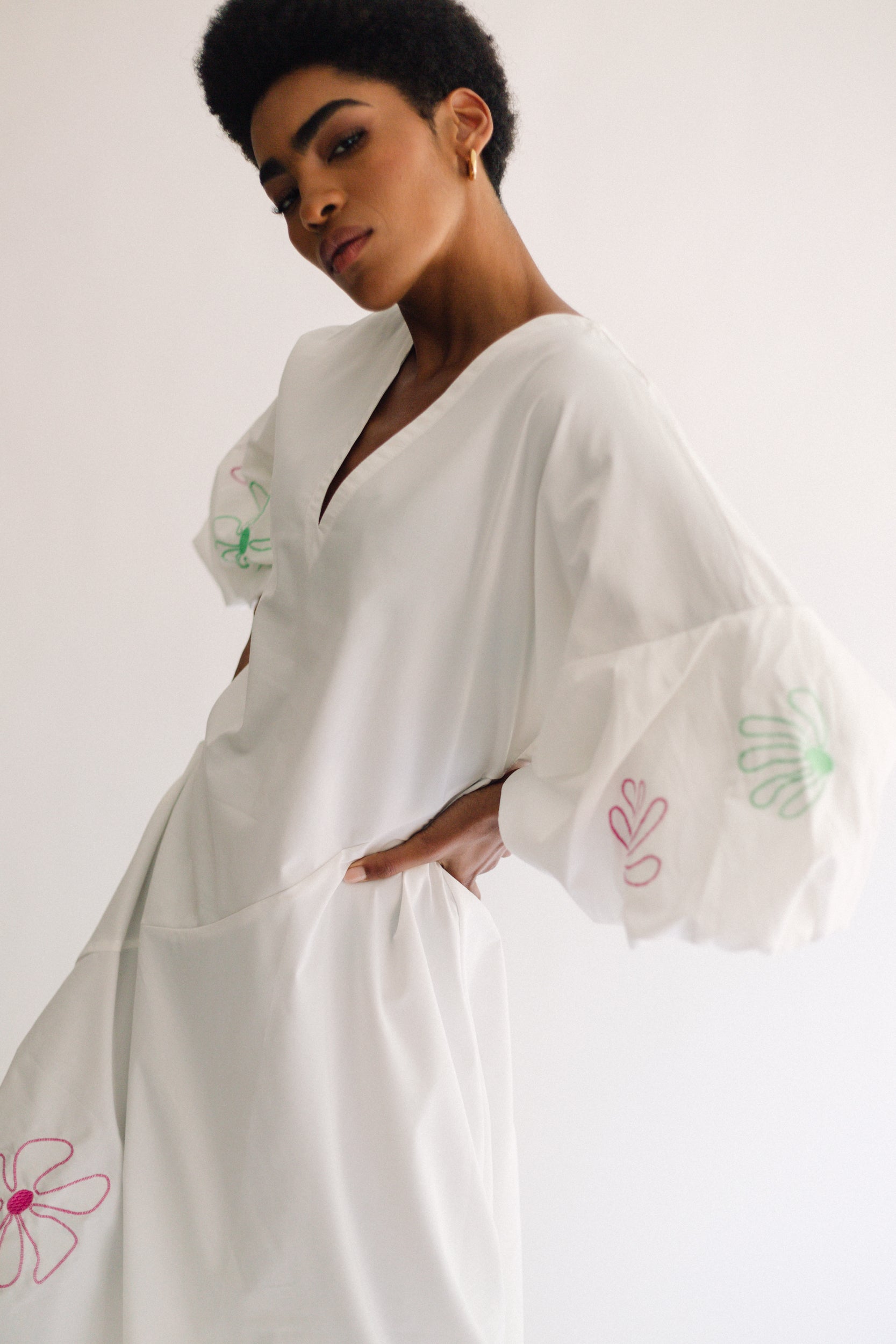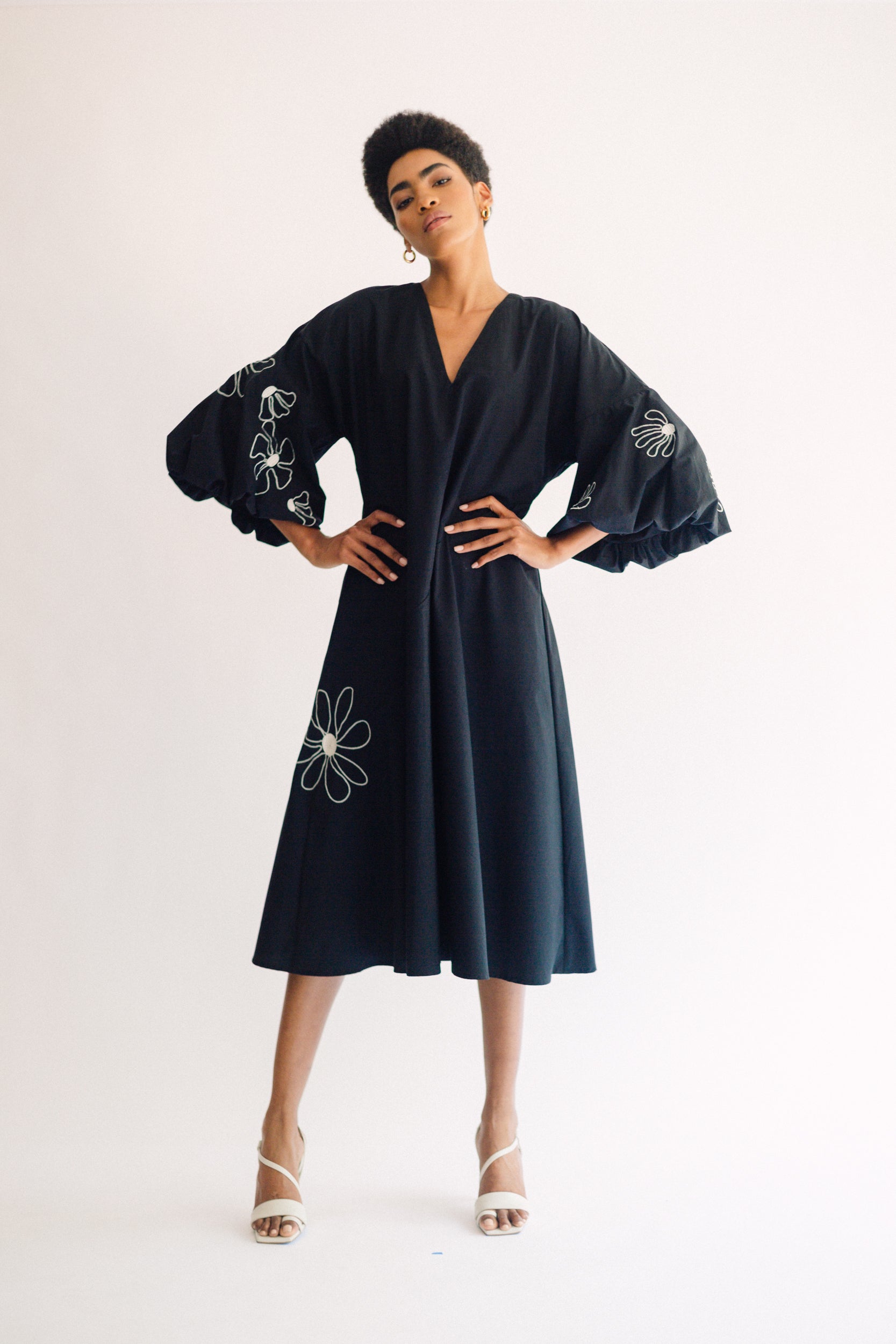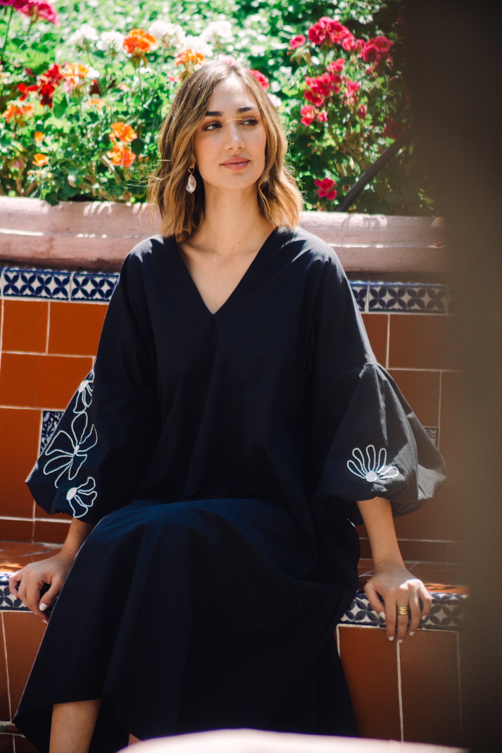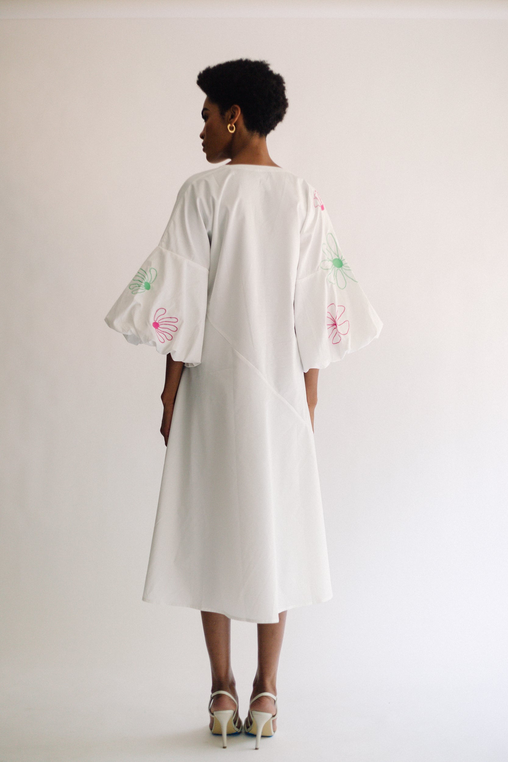 A celebration of artistry, this open A-line dress features a diagonal cut to enhance the elegance of its movement. While the classic V-neckline is imbued with understated beauty, the oversized puff sleeves and floral embroidery bring a boldness of form. More than just a dress, it’s a canvas for your mantra to be shared with the world.