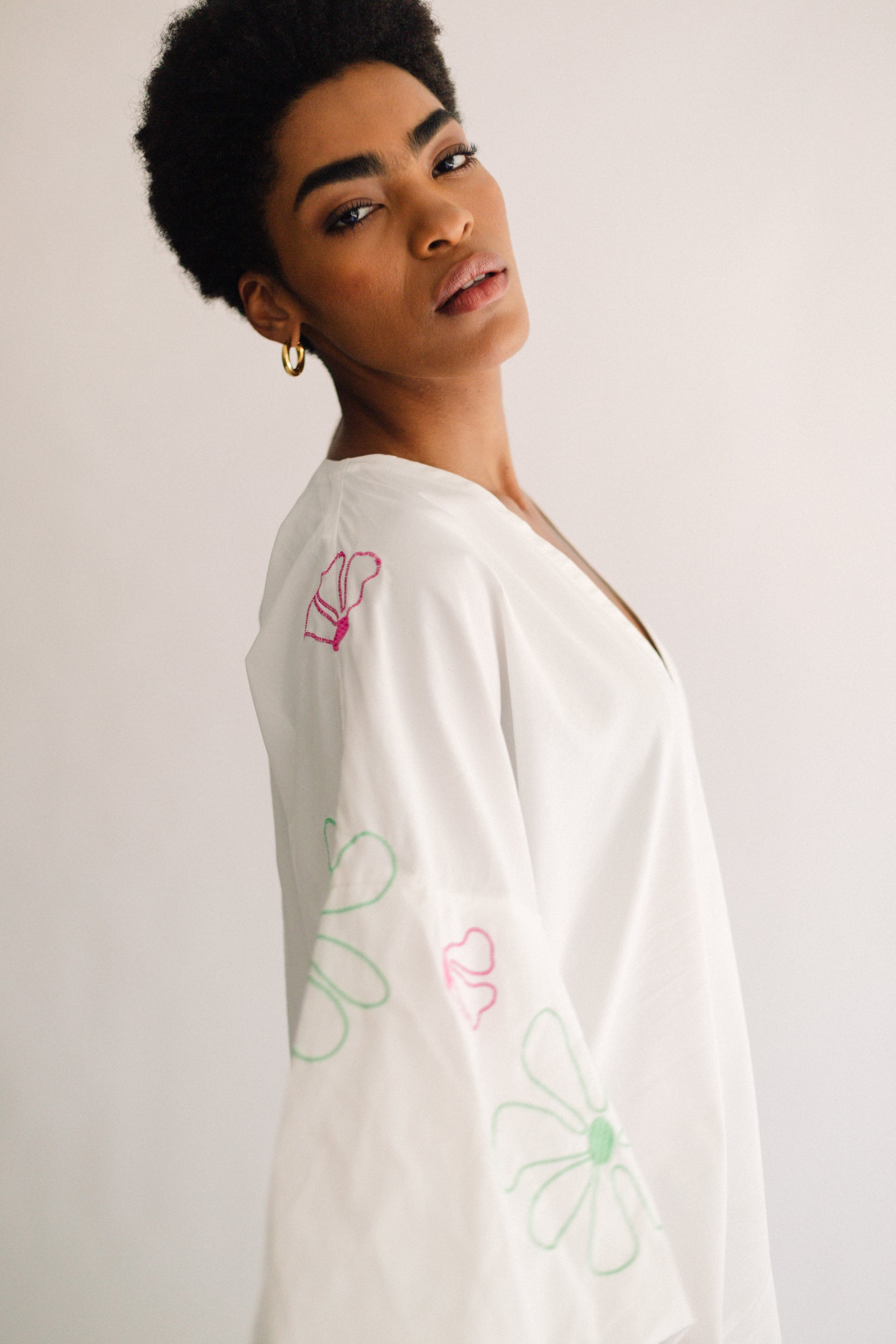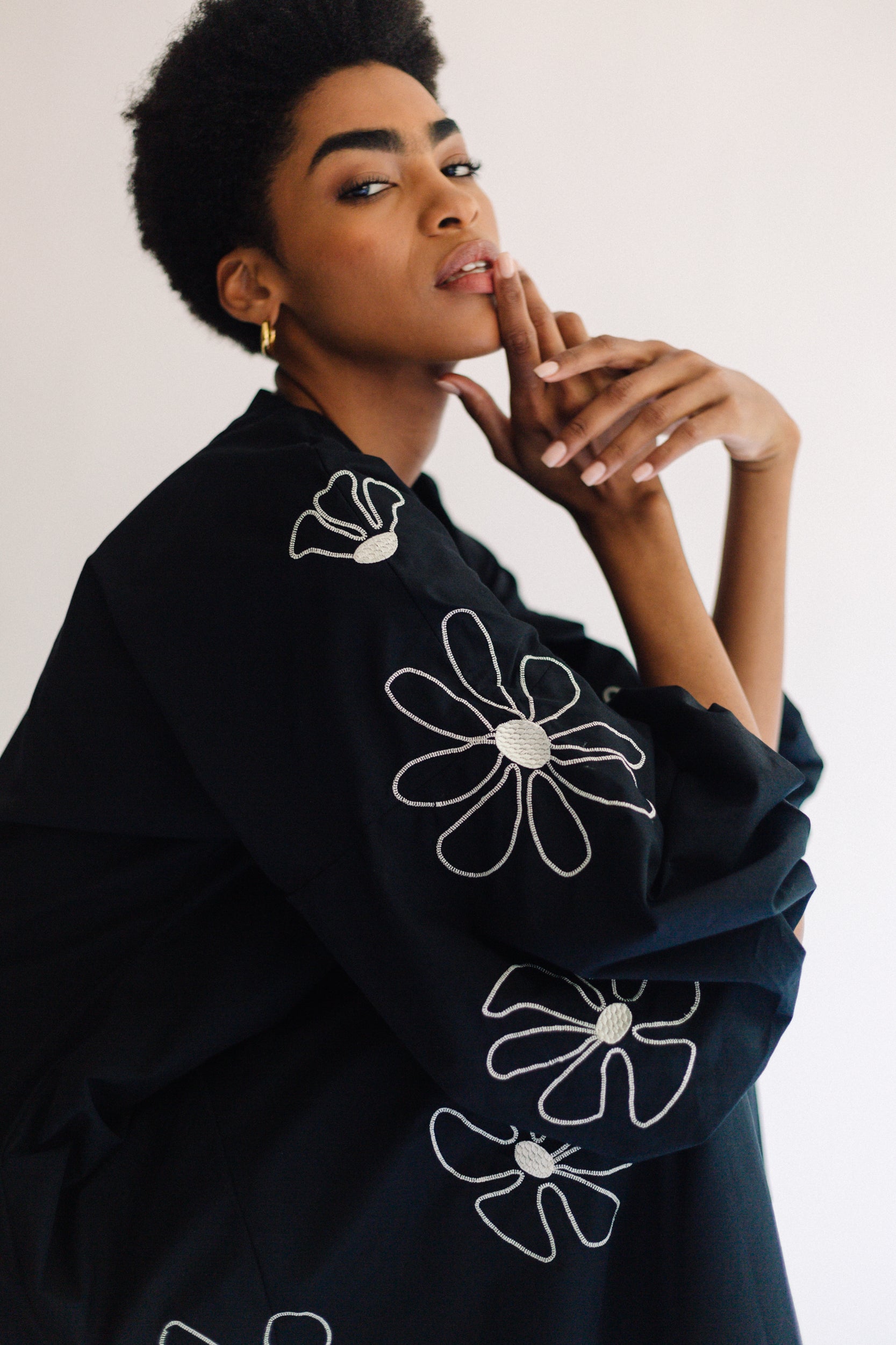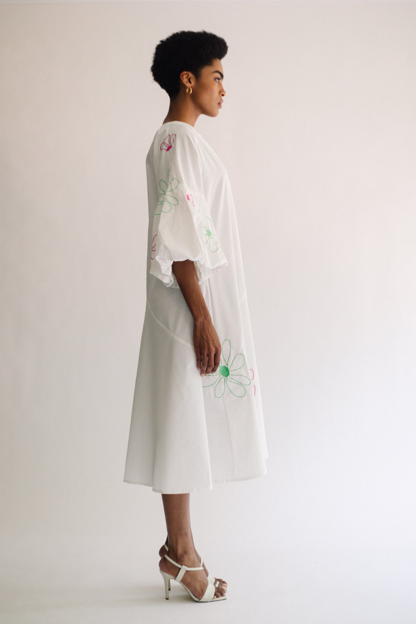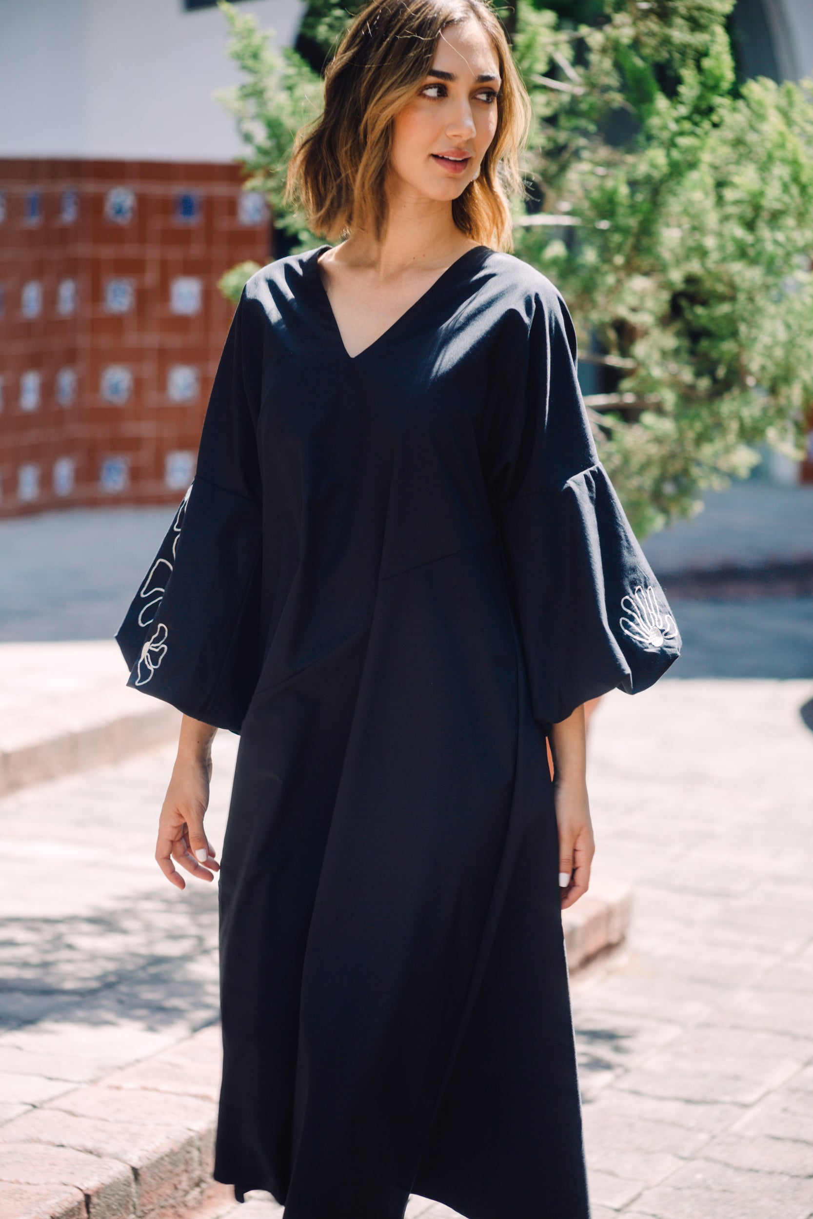 A celebration of artistry, this open A-line dress features a diagonal cut to enhance the elegance of its movement. While the classic V-neckline is imbued with understated beauty, the oversized puff sleeves and floral embroidery bring a boldness of form. More than just a dress, it’s a canvas for your mantra to be shared with the world.