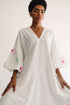 A celebration of artistry, this open A-line dress features a diagonal cut to enhance the elegance of its movement. While the classic V-neckline is imbued with understated beauty, the oversized puff sleeves and floral embroidery bring a boldness of form. More than just a dress, it’s a canvas for your mantra to be shared with the world.