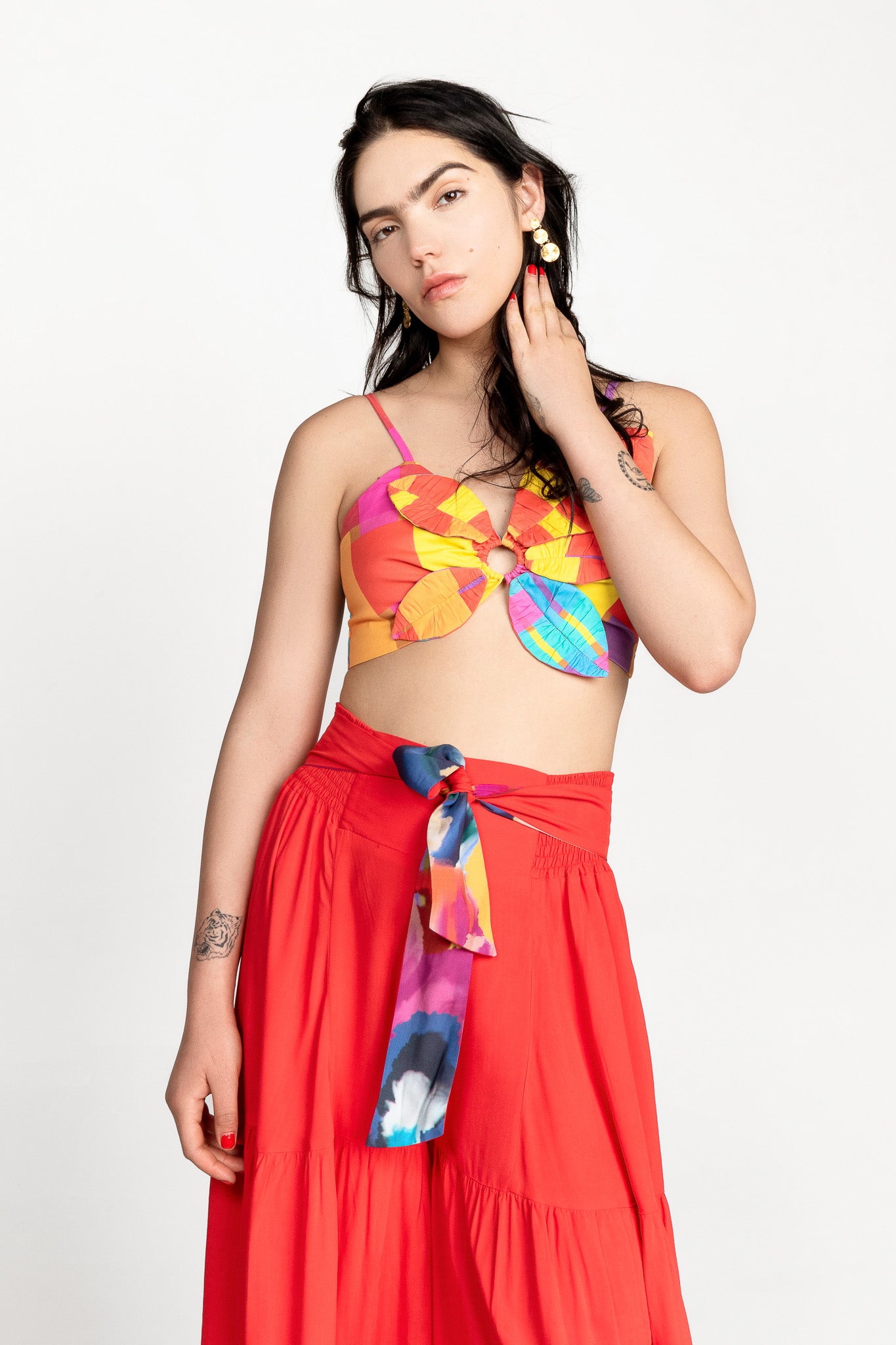 Handcrafted from two pieces of soft organic cotton, this dainty crop top is linked by a ring at the front and a delicate button at the back. Its beauty lies in the unique gathering technique, which creates a sculptural leaf shape on both sides. The perfect statement piece for basking in the sunshine.