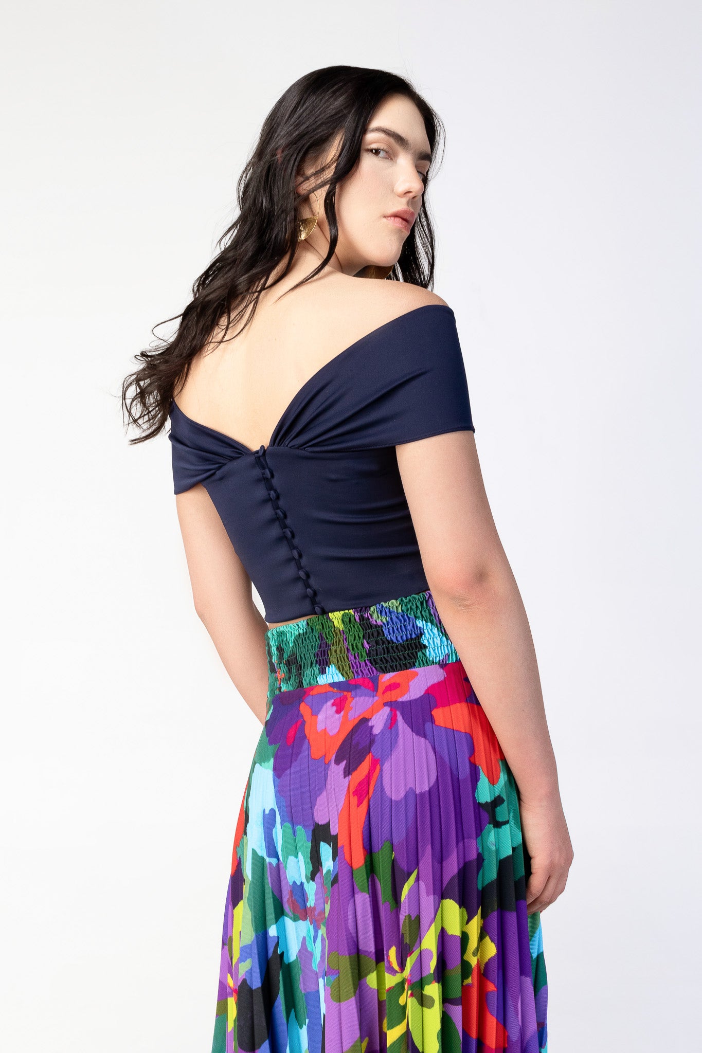 A balance of sultry and sweet, this artful top is designed for all occasions. Its off-the-shoulder neckline and delicate buttons down the back bring beauty and sophistication to any event - day or night. With a corset-like fit and timeless beauty, we guarantee you will feel empowered every time you wear it.