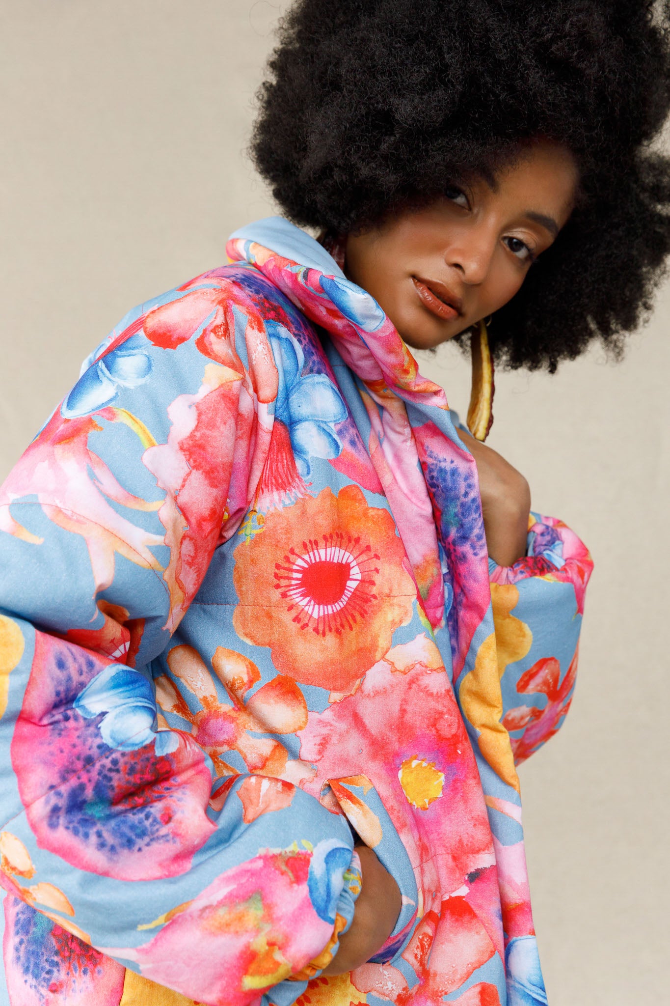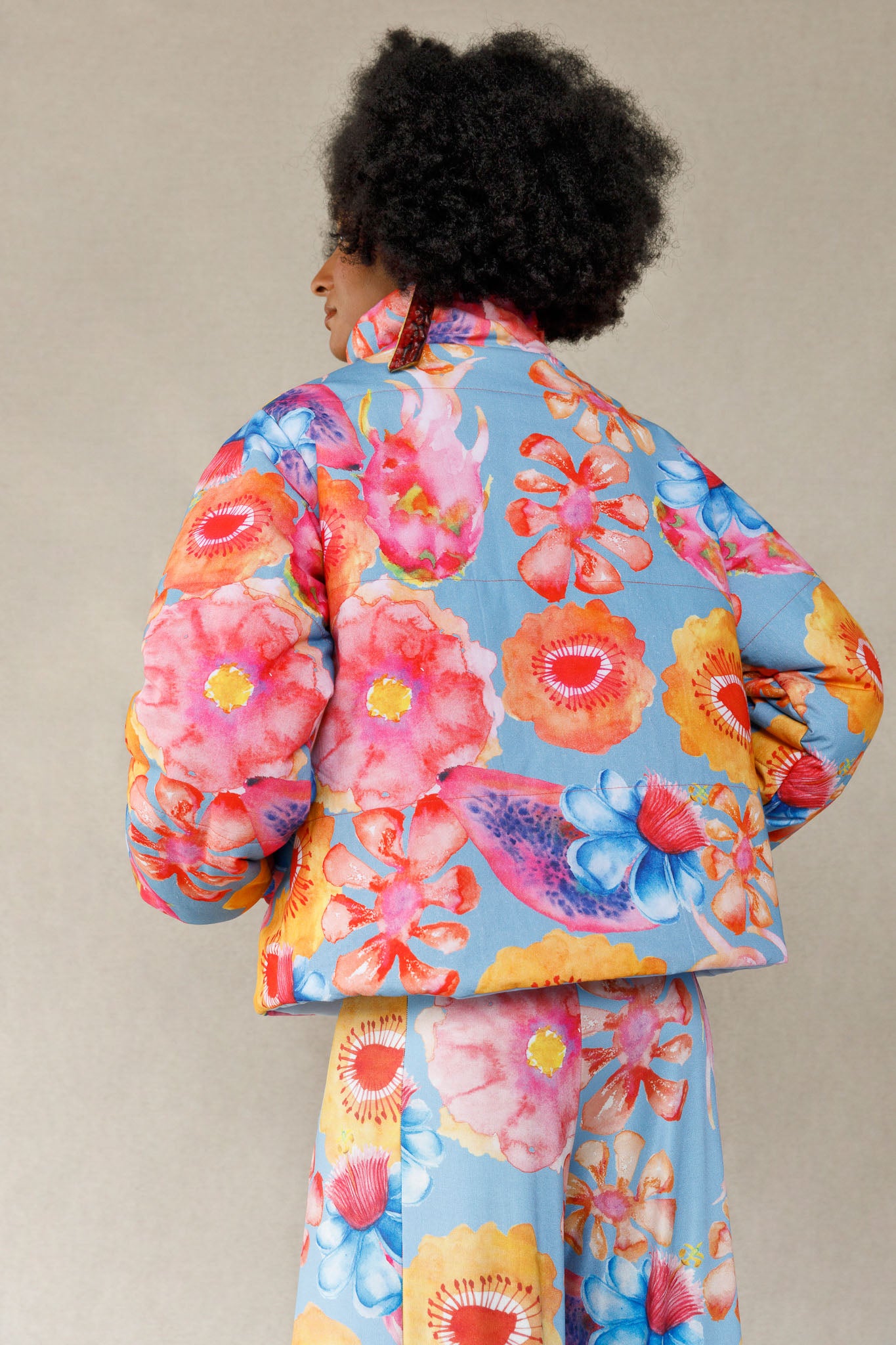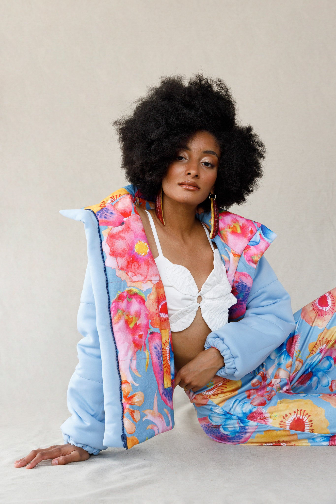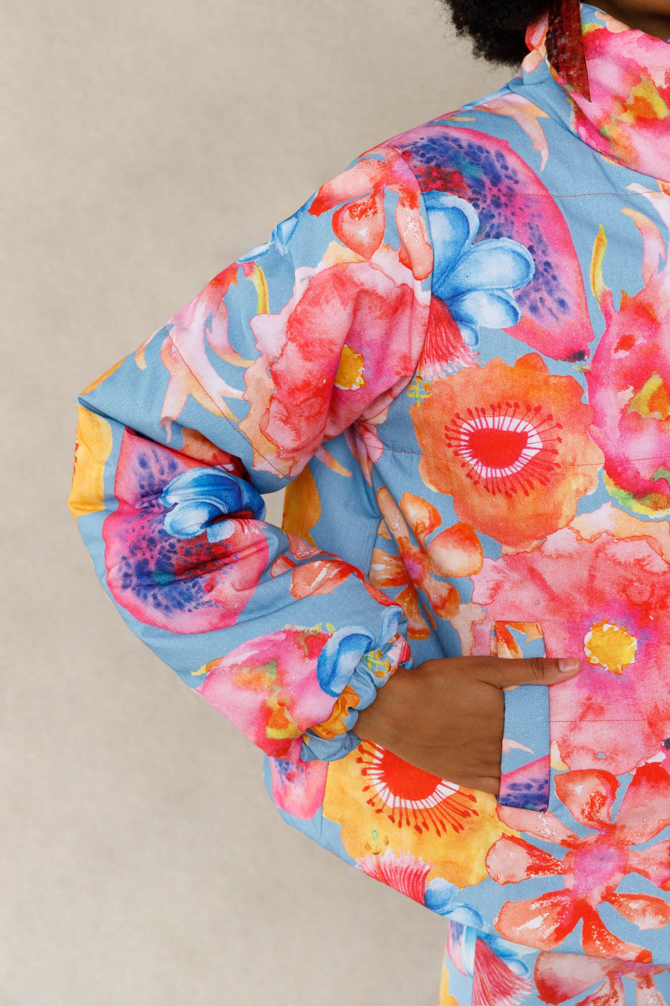 Suave o fuerte: deja que tu voz se escuche. Esta chaqueta reversible de gran tamaño te mantiene abrigado y te asegura que destaques. Un lado presenta un tono azul hielo, mientras que el otro está estampado con un colorido motivo floral y de frutas. Los pequeños detalles como el fruncido elástico en los puños y los bolsillos laterales hacen de esta chaqueta la combinación perfecta de función y forma. Completa el look con nuestro pantalón Clarita.
