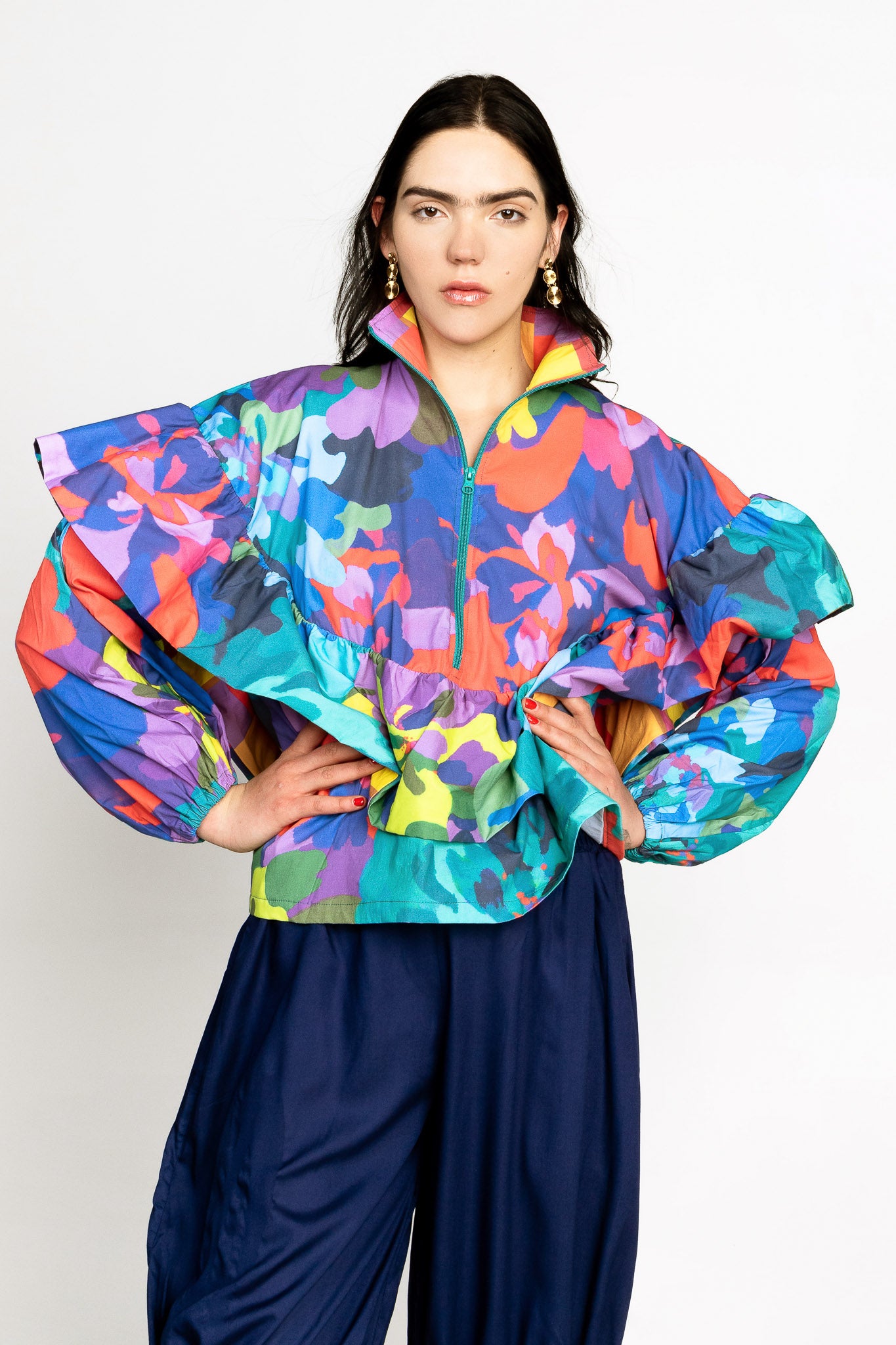Con un estampado atrevido y un volante con forma de flor en el canesú, esta media cremallera femenina es llamativa y tiene un diseño vanguardista, perfecto para hacer una declaración. Es tan funcional como hermoso con un cuello alto y mangas abullonadas que terminan en un fruncido elástico en la muñeca. Úsalo como chaqueta o blusa dependiendo del clima.