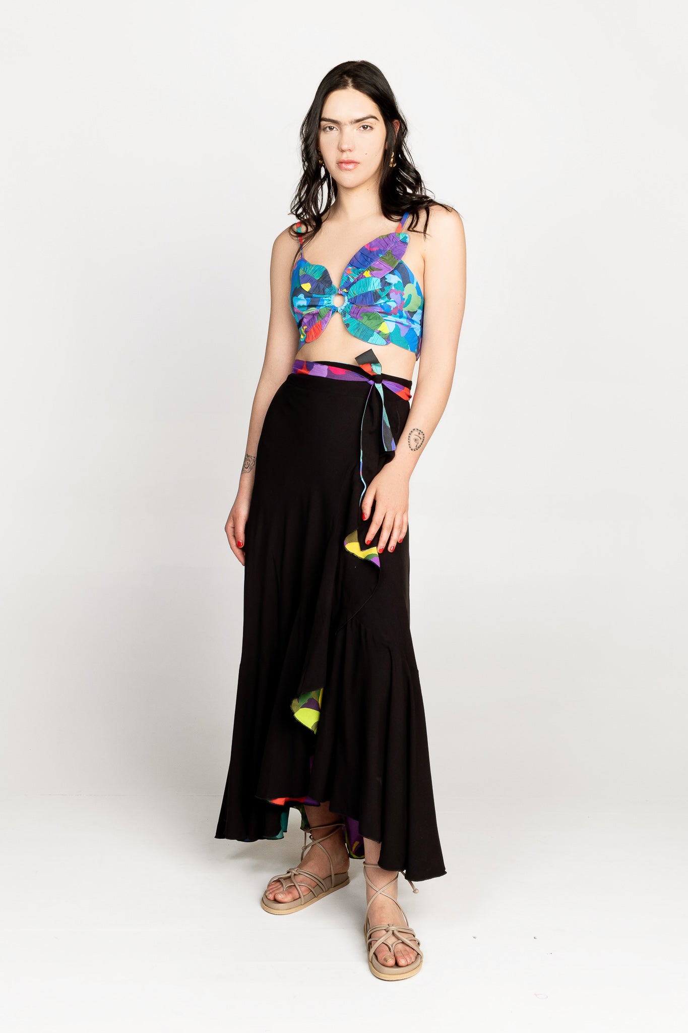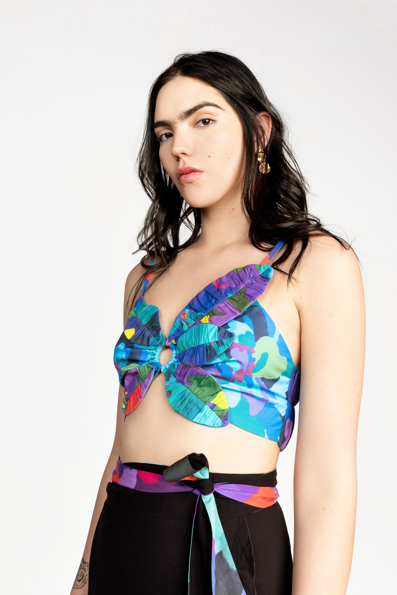 Confeccionado a mano con dos piezas de suave algodón orgánico, este delicado top corto está unido por un anillo en la parte delantera y un delicado botón en la parte posterior. Su belleza radica en la técnica única de fruncido, que crea una forma de hoja escultórica en ambos lados. La pieza de declaración perfecta para tomar el sol.