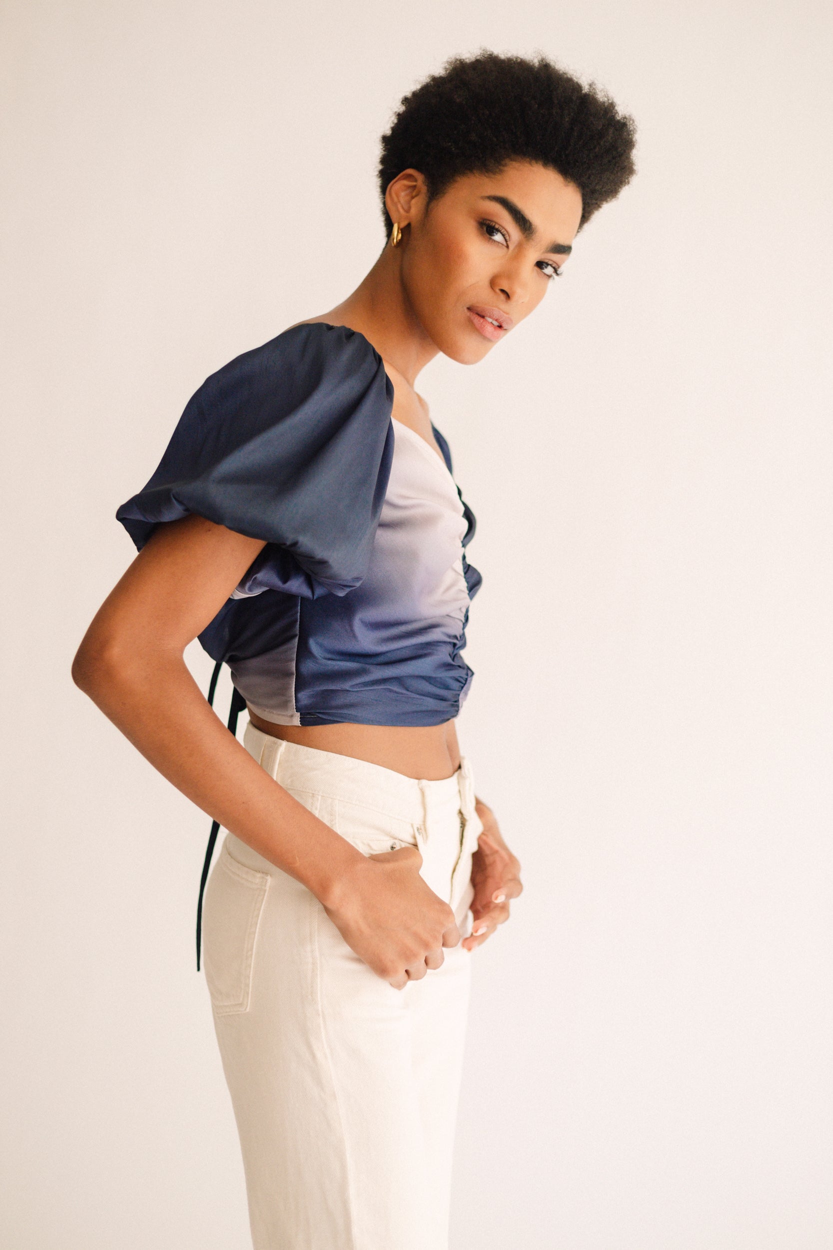Una visión de degradado, esta belleza fruncida es cualquier cosa menos una camiseta ordinaria. Diseñado para realzar cualquier atuendo, presenta un hermoso corte ovalado en la parte posterior y un fruncido ajustable en la parte delantera. Úsalo como un estilo más ceñido al cuerpo, o déjalo más suelto para una comodidad informal en el día a día.