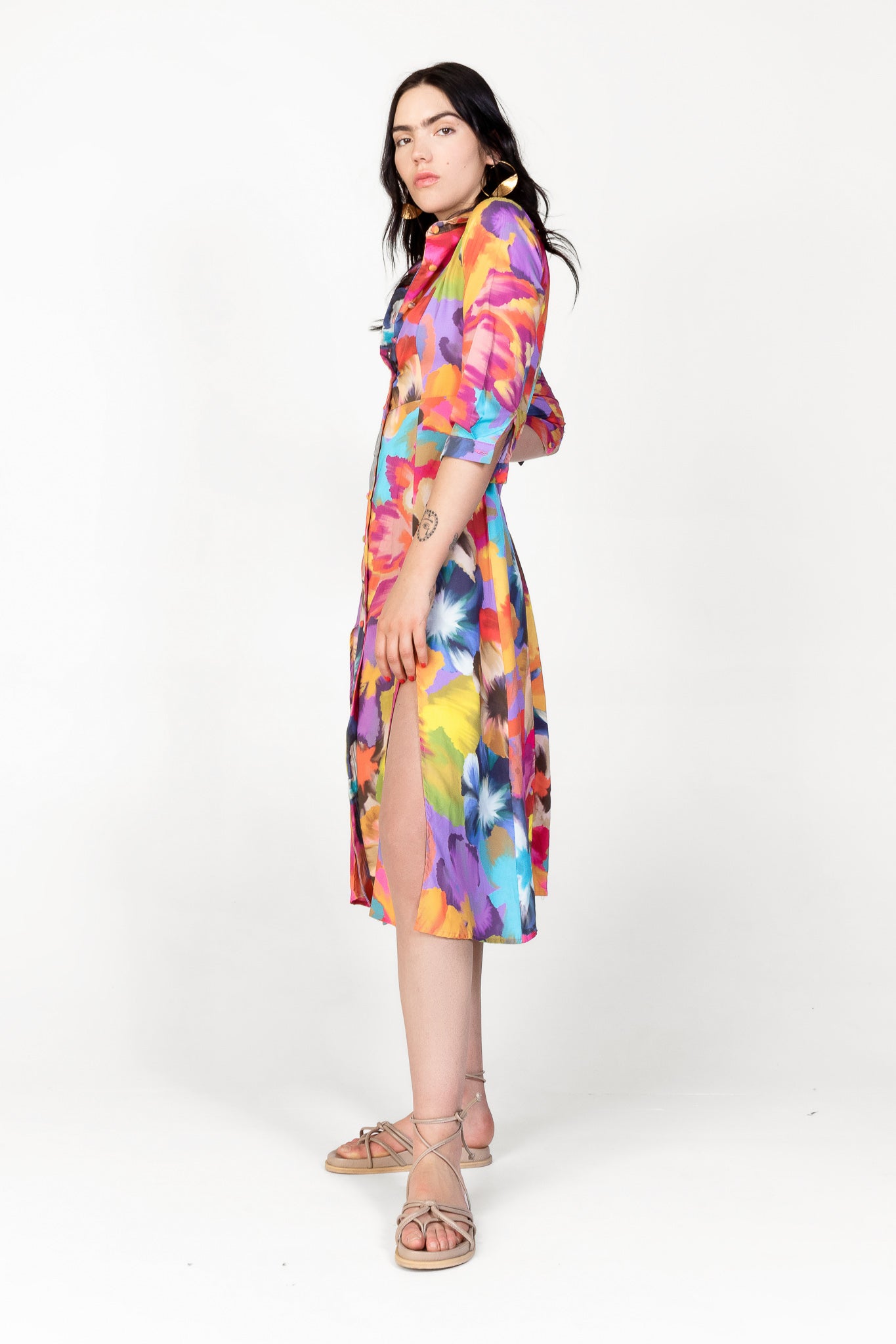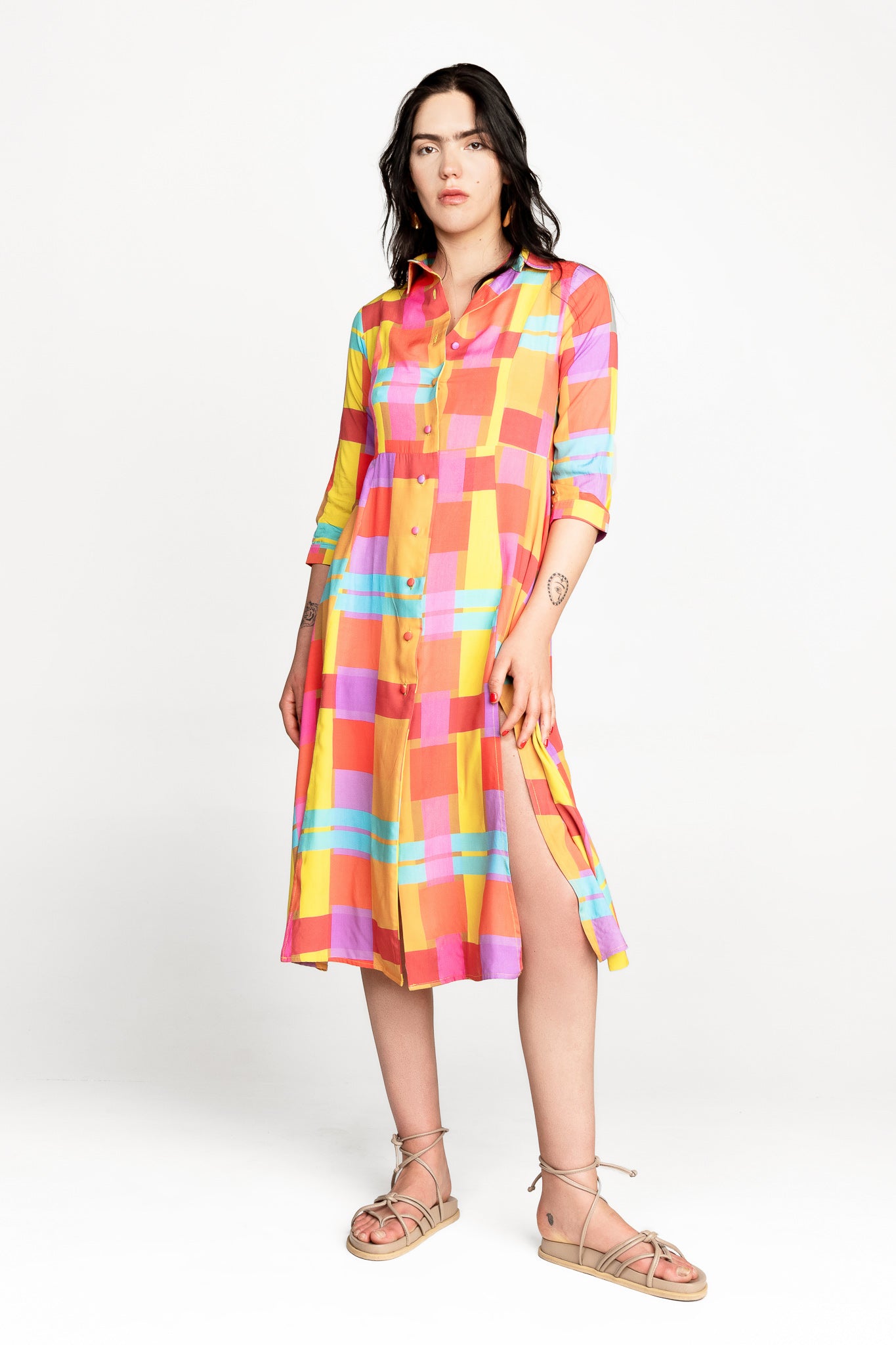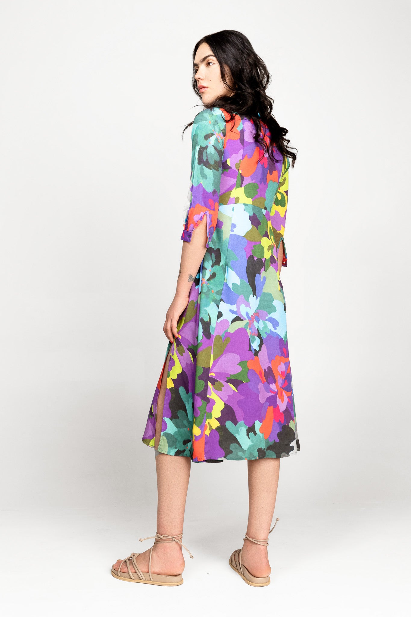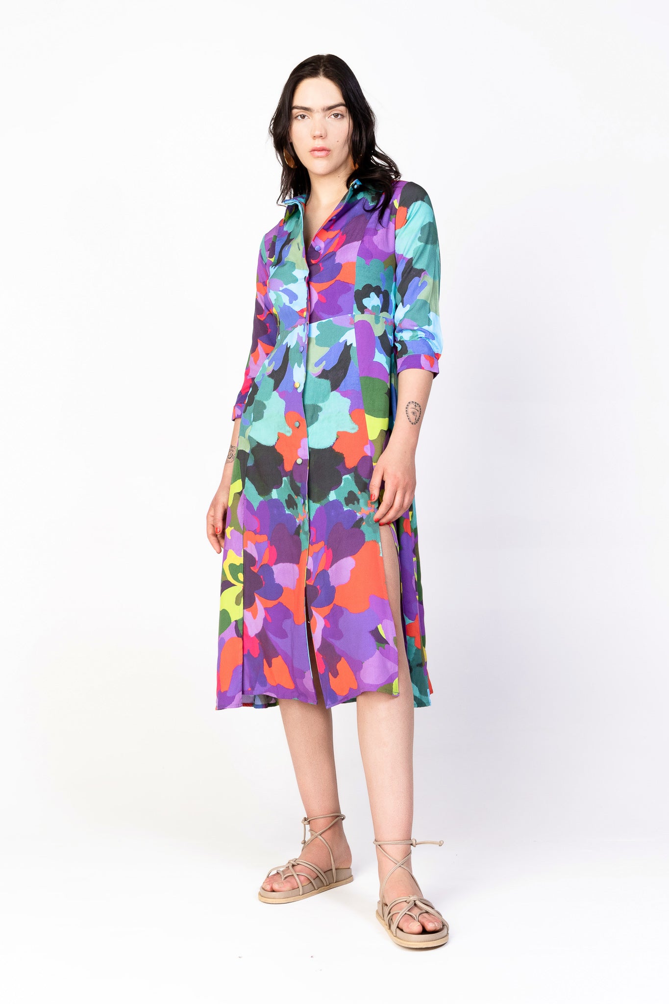 Este vestido camisero de largo medio, una versión mejorada de un clásico básico de guardarropa, está acentuado con detalles artísticos. La silueta entallada y acampanada define la cintura, mientras que las aberturas en las mangas y los costados brindan comodidad y estilo. Confeccionado en algodón 100 % orgánico, este hermoso vestido para todos los días llenará de color tu guardarropa con nuestro estampado floral o geométrico de jardín.
