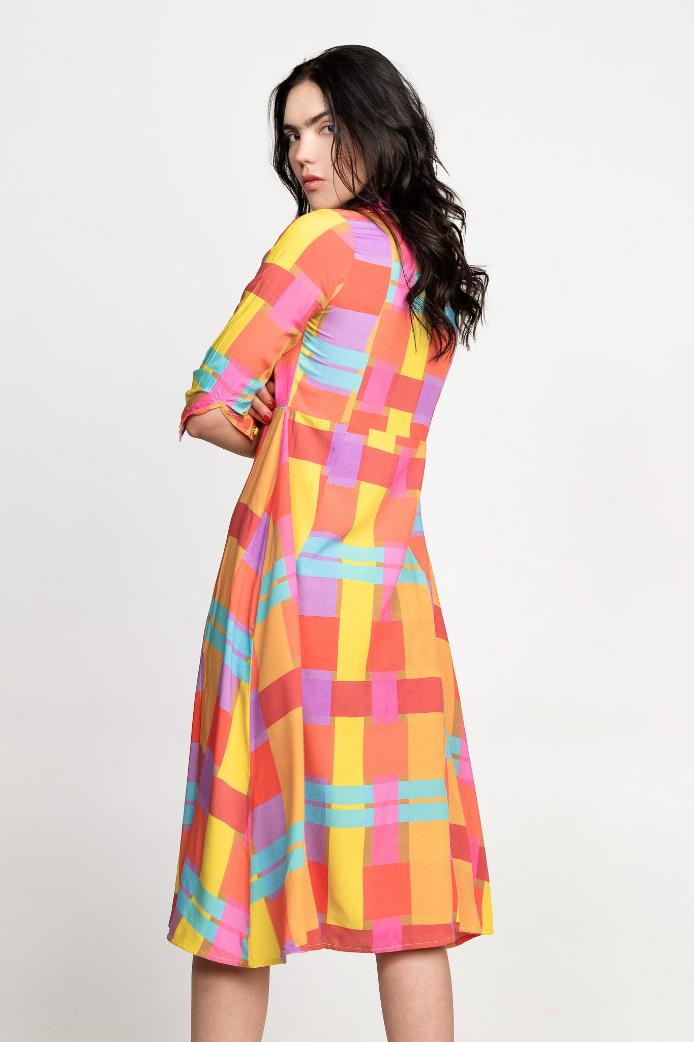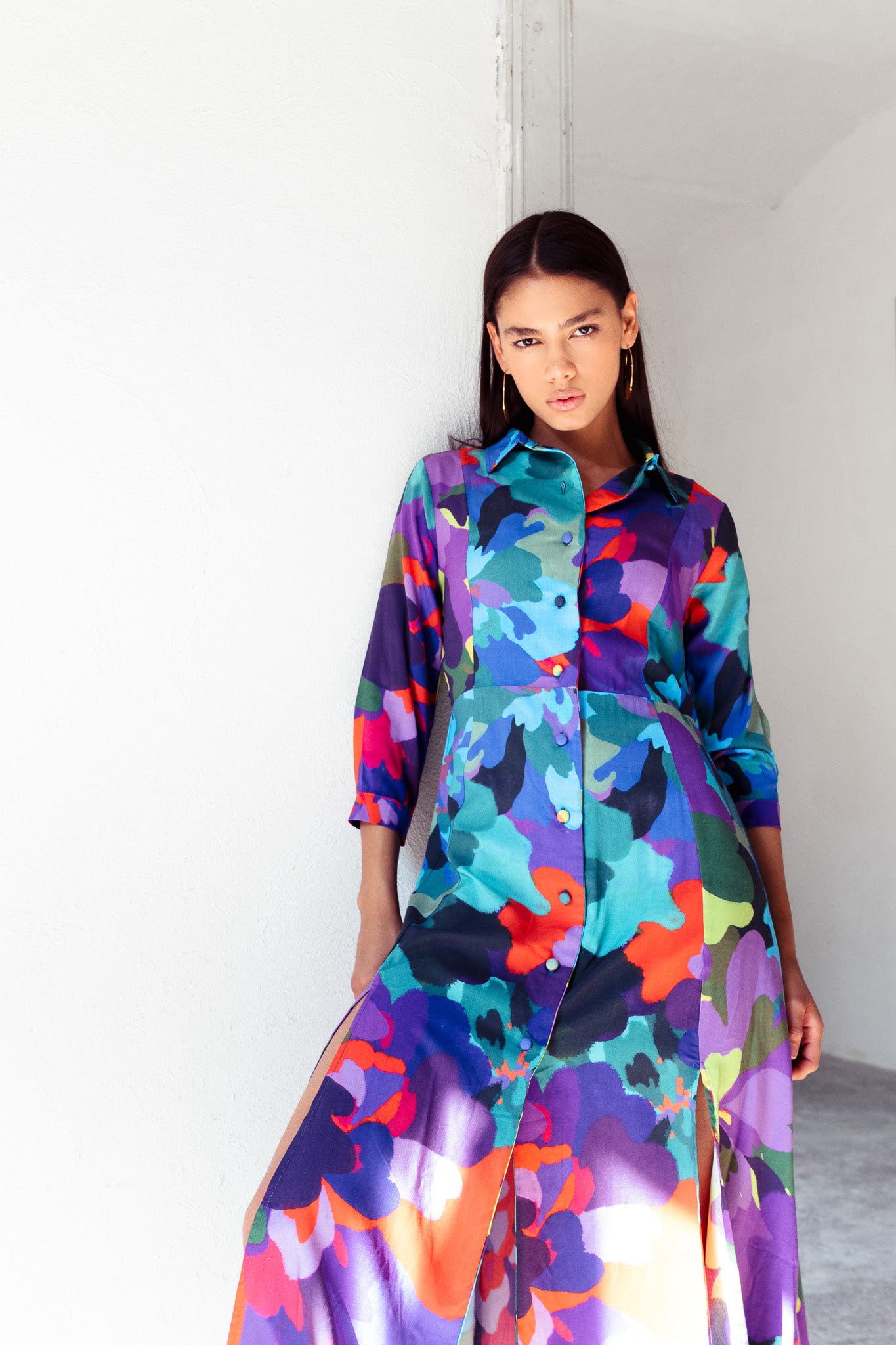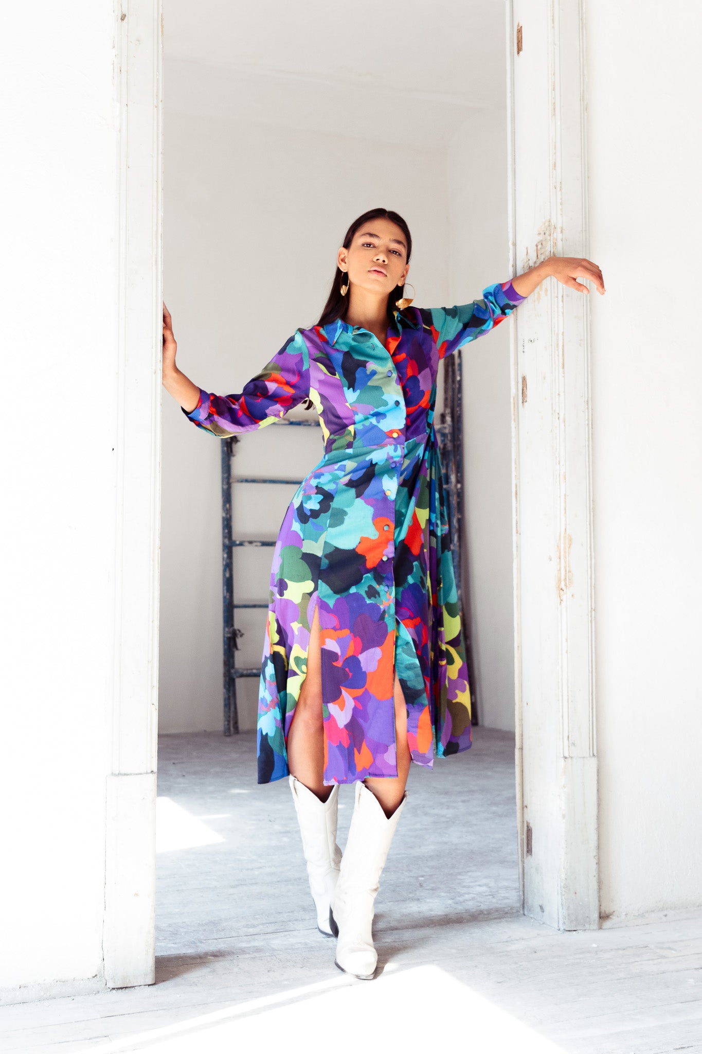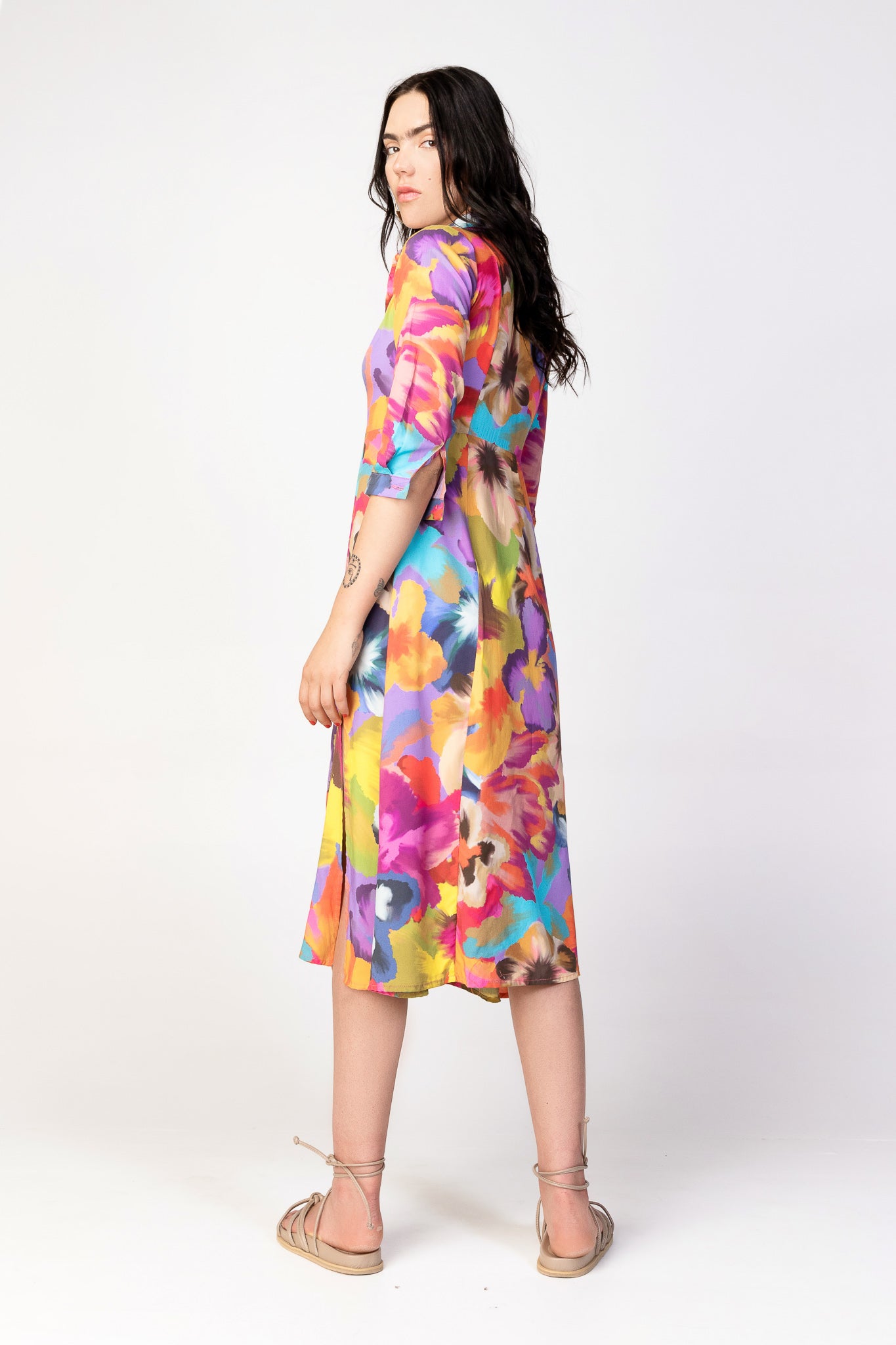 Este vestido camisero de largo medio, una versión mejorada de un clásico básico de guardarropa, está acentuado con detalles artísticos. La silueta entallada y acampanada define la cintura, mientras que las aberturas en las mangas y los costados brindan comodidad y estilo. Confeccionado en algodón 100 % orgánico, este hermoso vestido para todos los días llenará de color tu guardarropa con nuestro estampado floral o geométrico de jardín.