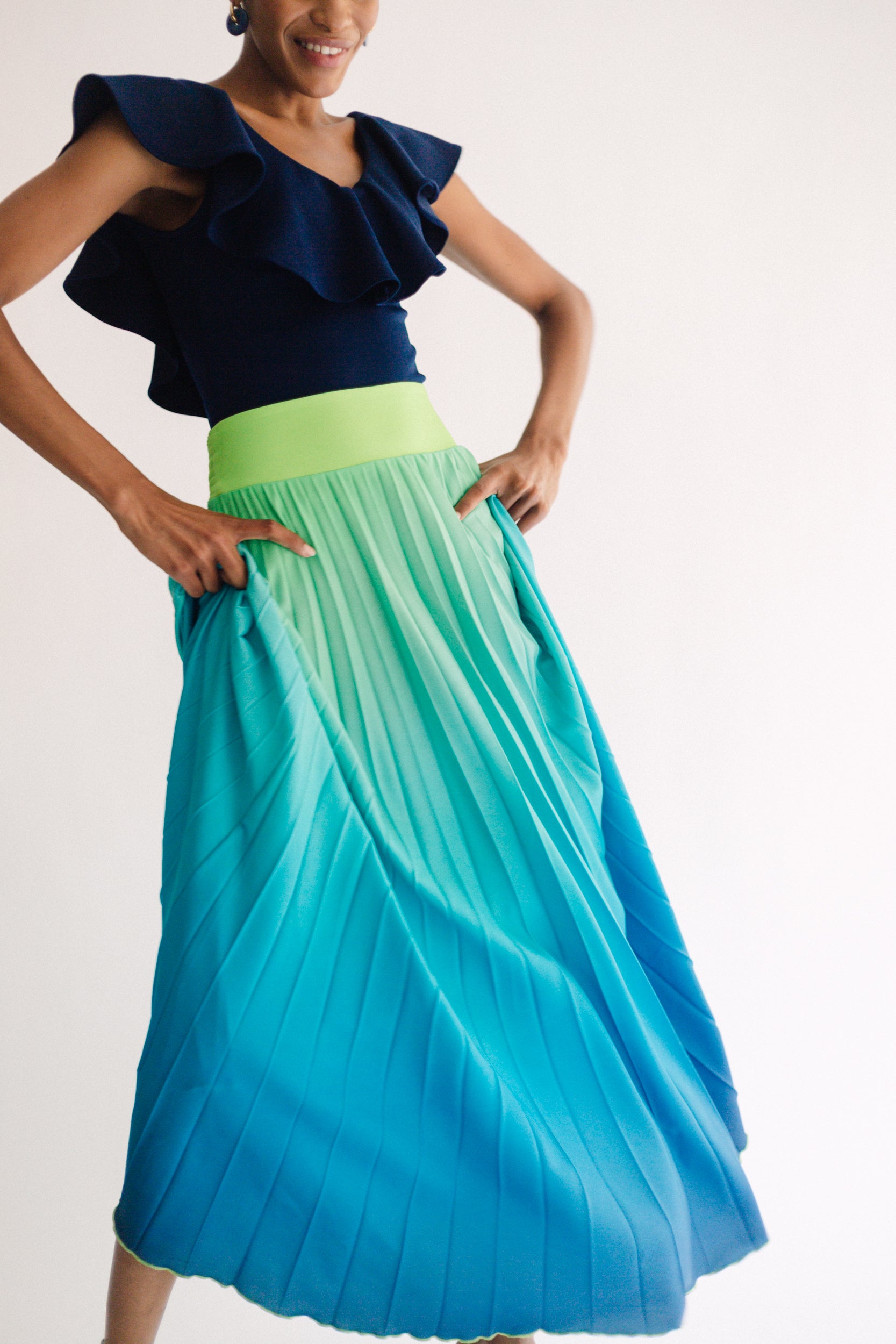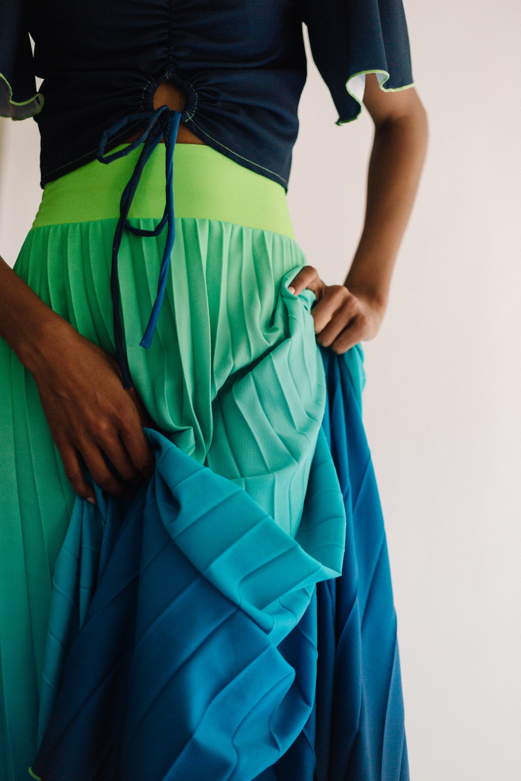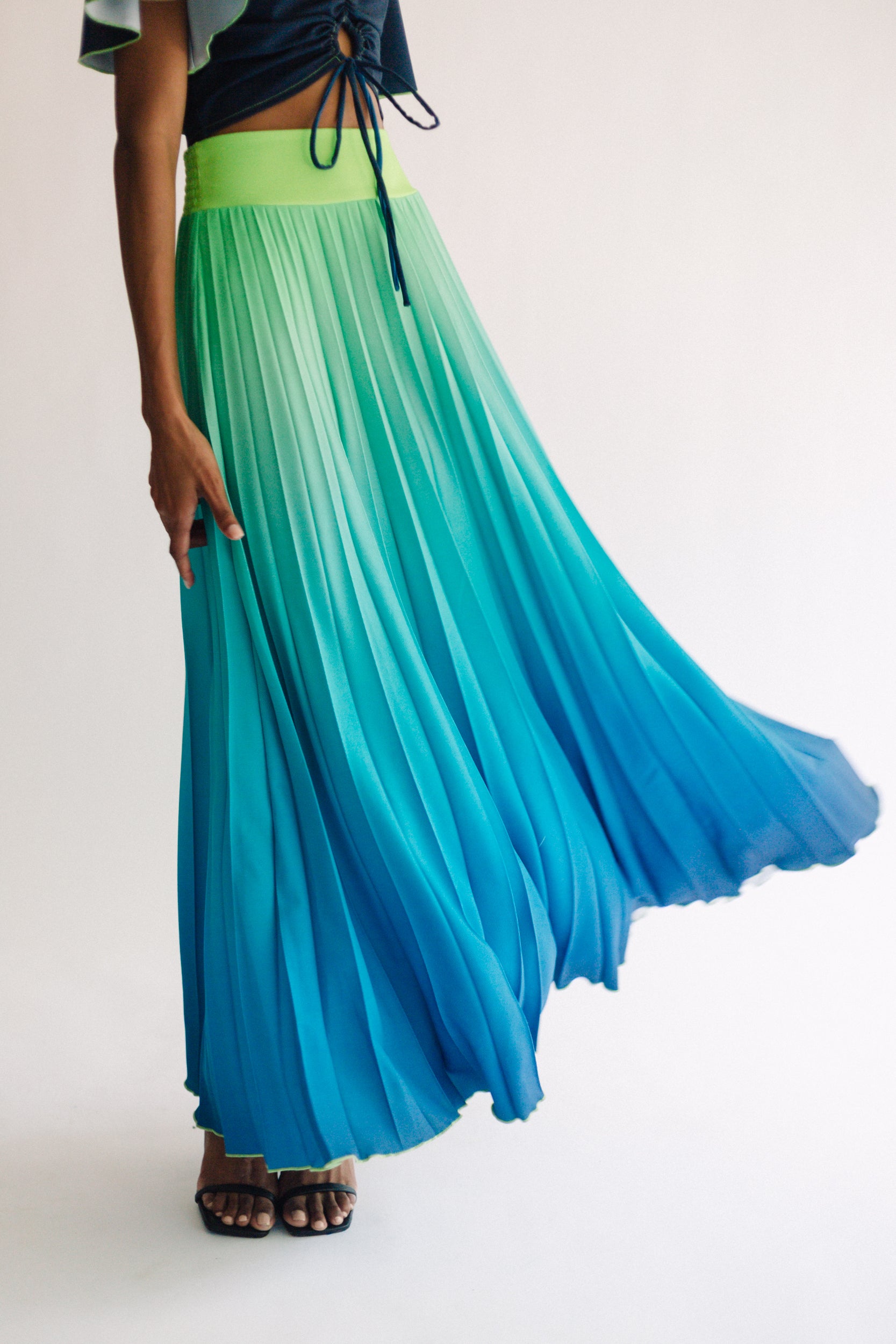 Como si estuviera imbuida del aura de quien la lleva, esta falda larga plisada es la encarnación escultórica del estilo. La creatividad, la belleza y el dinamismo se unen cuando cada pliegue individual da movimiento a la forma máxima. Con un dobladillo que roza el suelo, la falda parece deslizarse con gracia mientras caminas. Vestido con tonos fascinantes, no puedes evitar sentir tu espíritu brillar de día o de noche. Combínalo con nuestro Aura Top.
