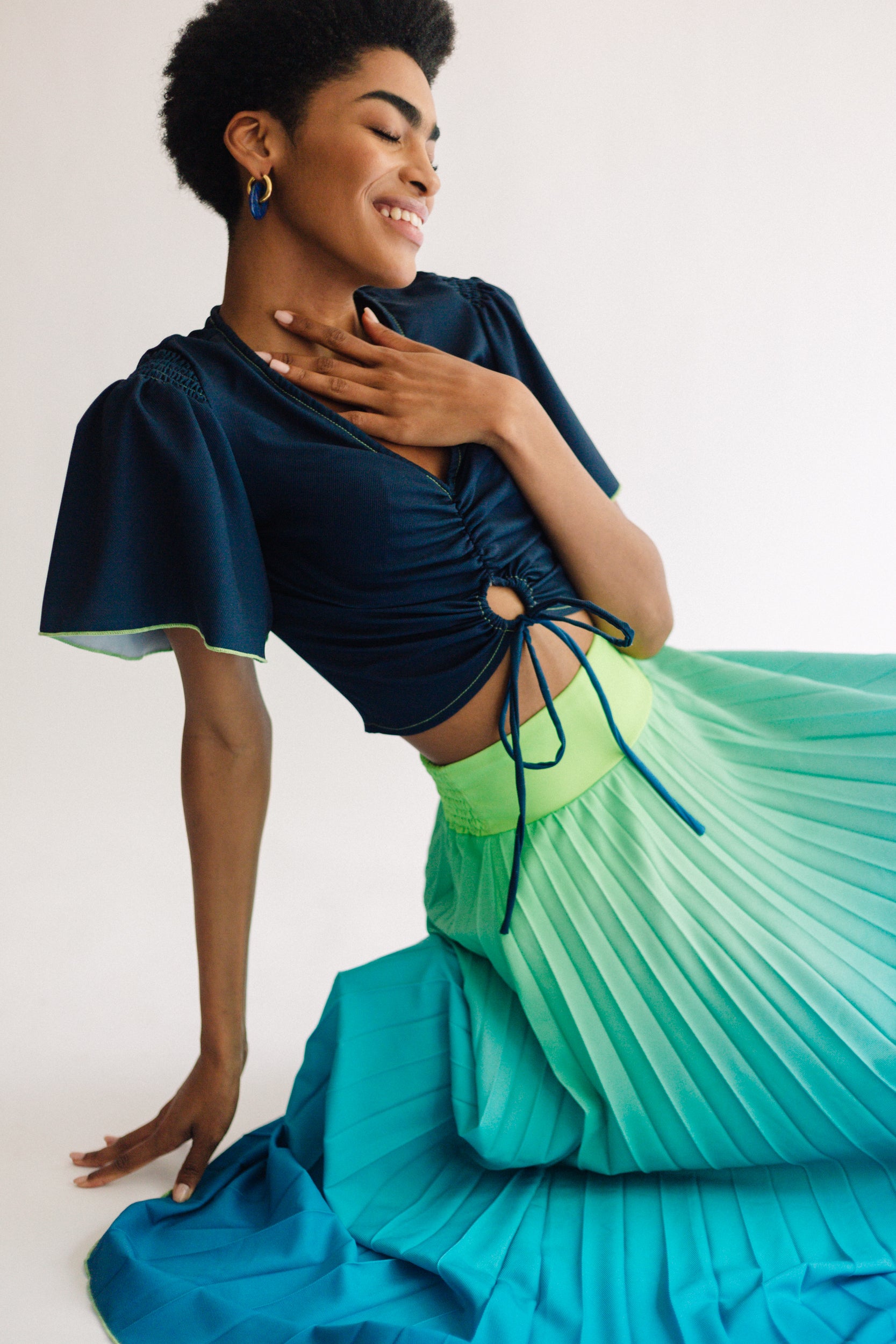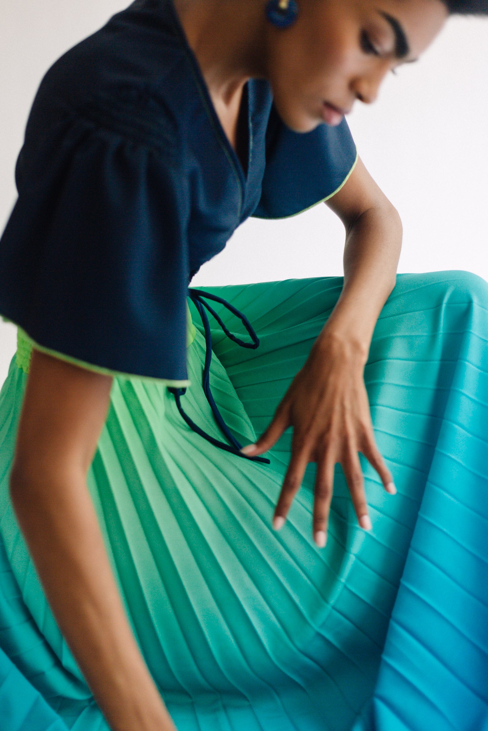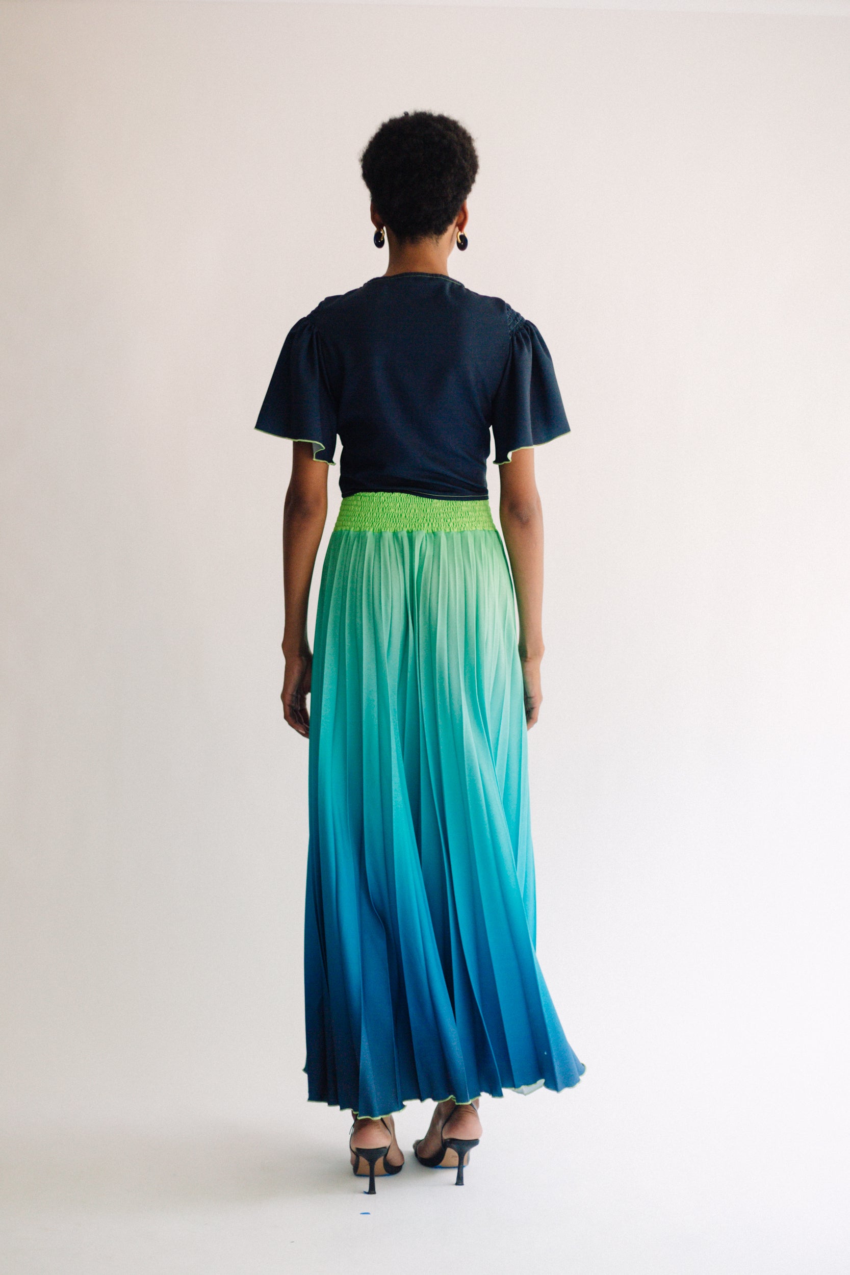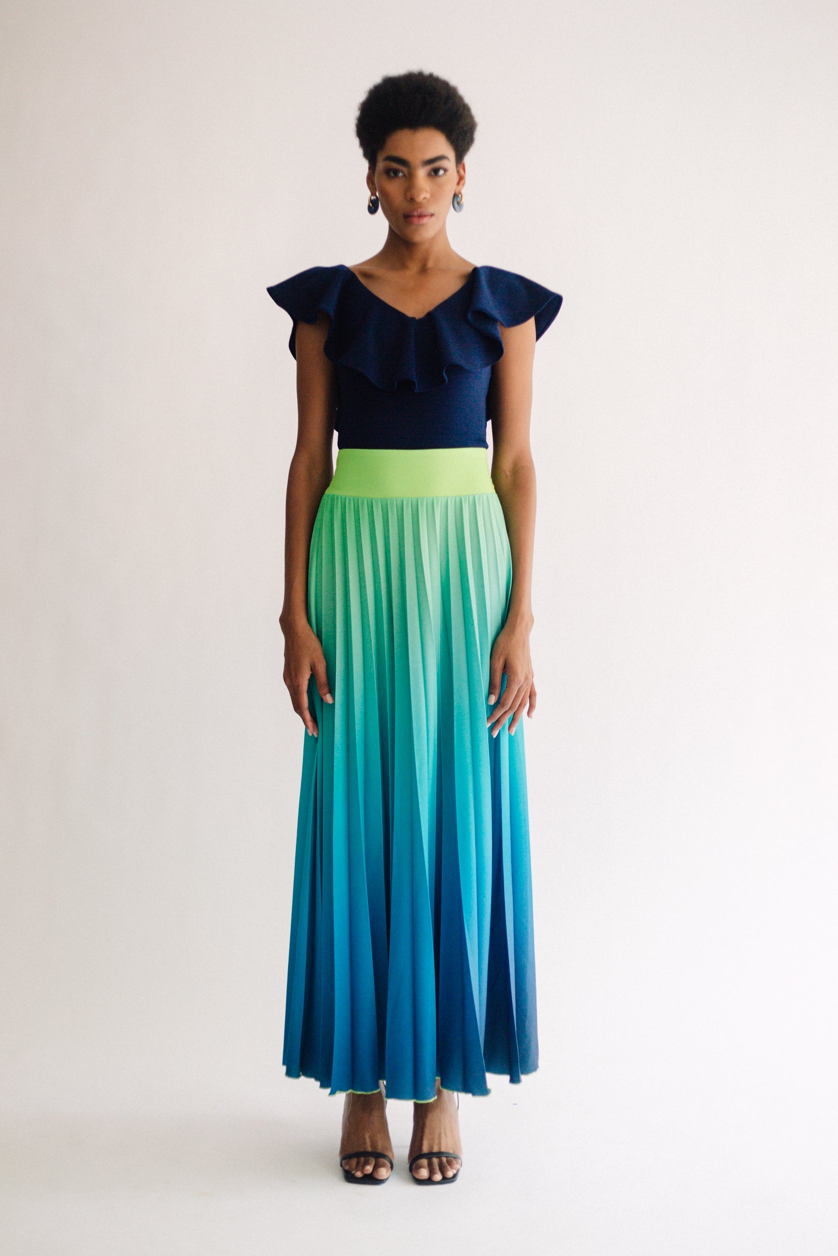 Como si estuviera imbuida del aura de quien la lleva, esta falda larga plisada es la encarnación escultórica del estilo. La creatividad, la belleza y el dinamismo se unen cuando cada pliegue individual da movimiento a la forma máxima. Con un dobladillo que roza el suelo, la falda parece deslizarse con gracia mientras caminas. Vestido con tonos fascinantes, no puedes evitar sentir tu espíritu brillar de día o de noche. Combínalo con nuestro Aura Top.