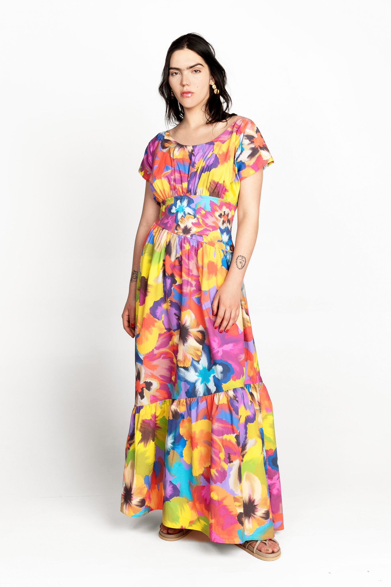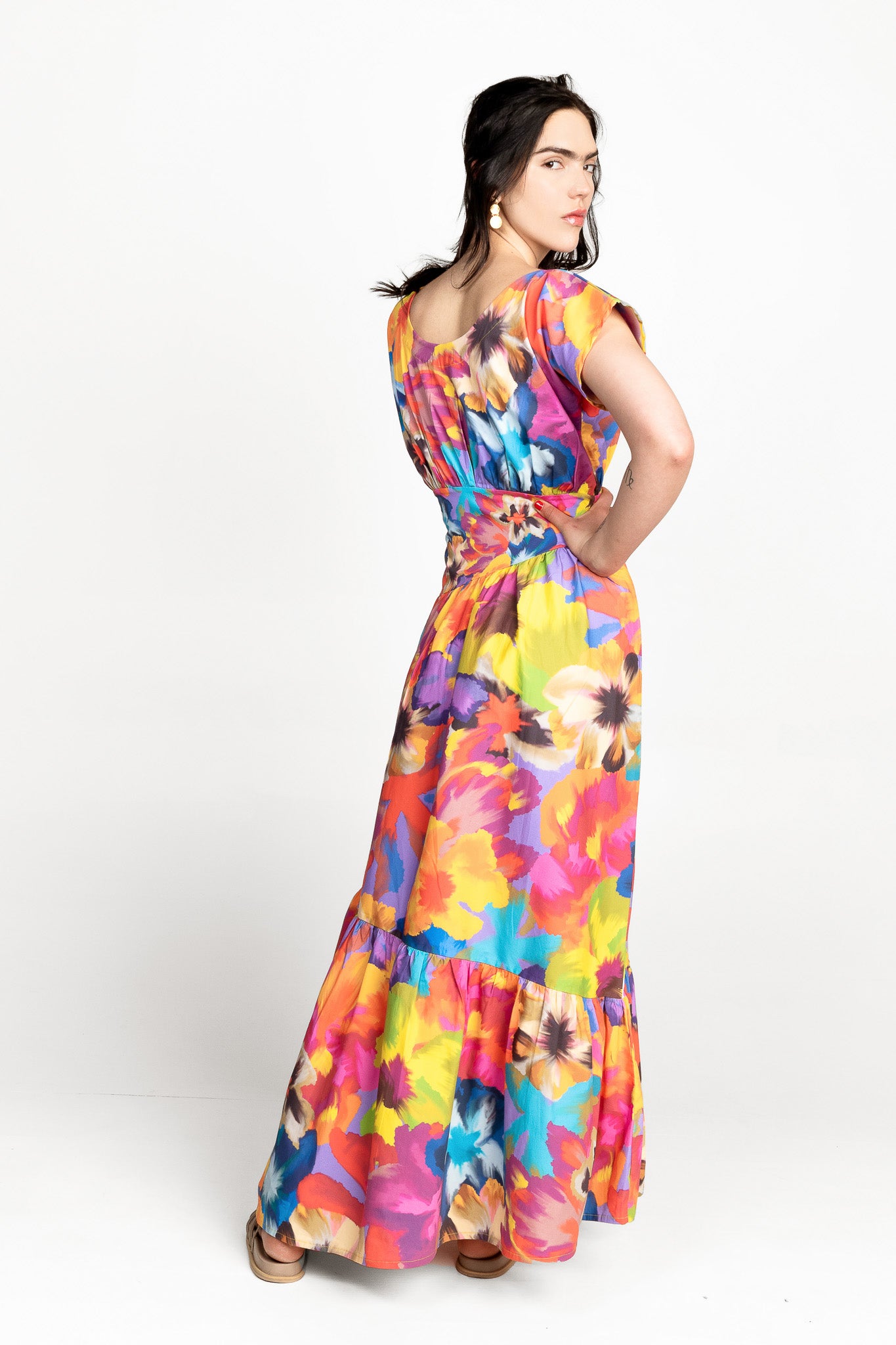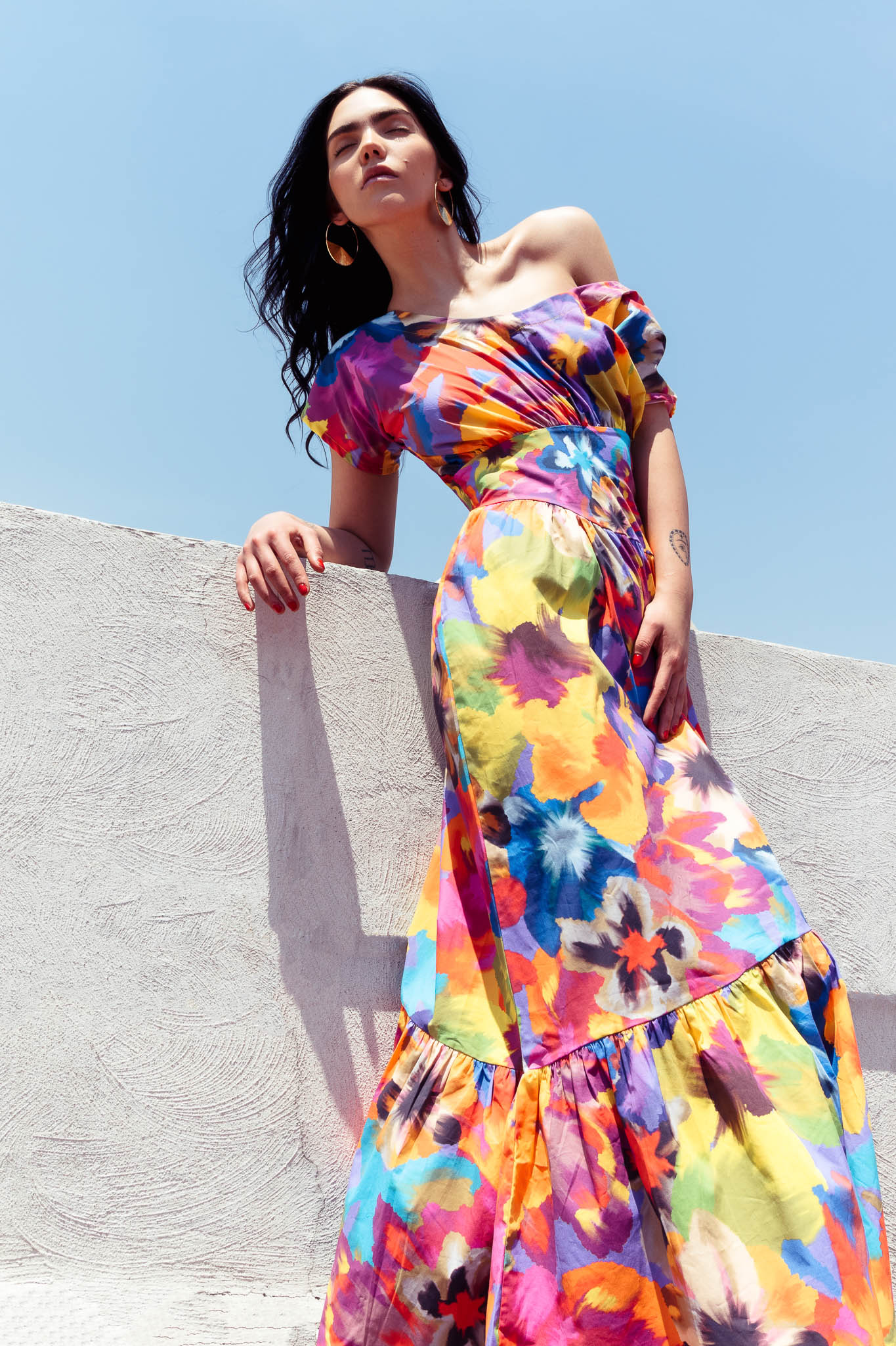 Hay mucho que amar de este sueño de un vestido. Tiene un escote barco con hombros descubiertos, una favorecedora cinturilla asimétrica y un volante fluido que comienza en la rodilla. Estarás radiante mientras paseas bajo el sol en esta vibrante maravilla floral.