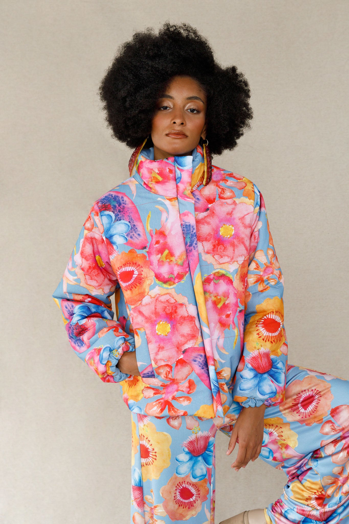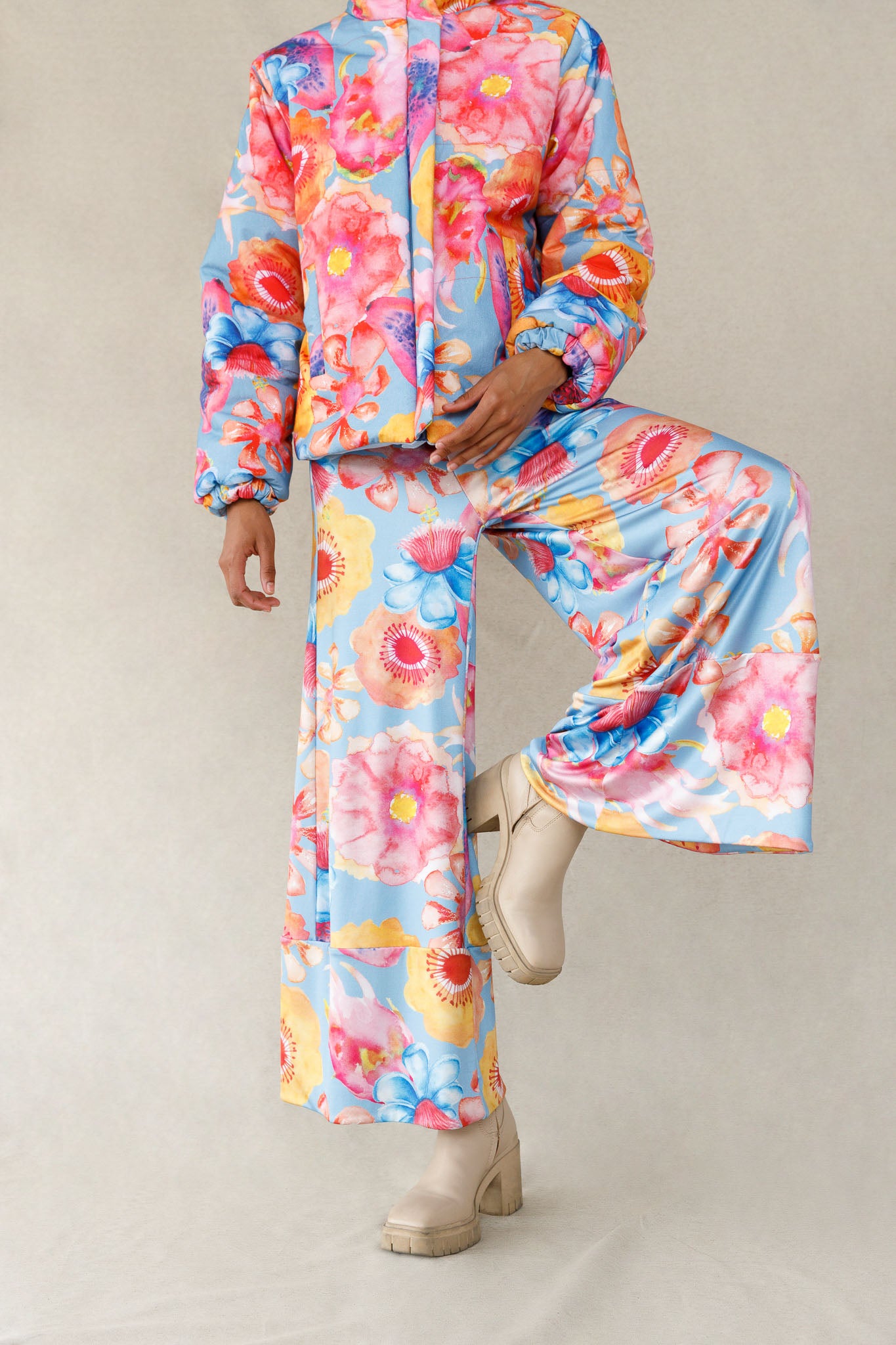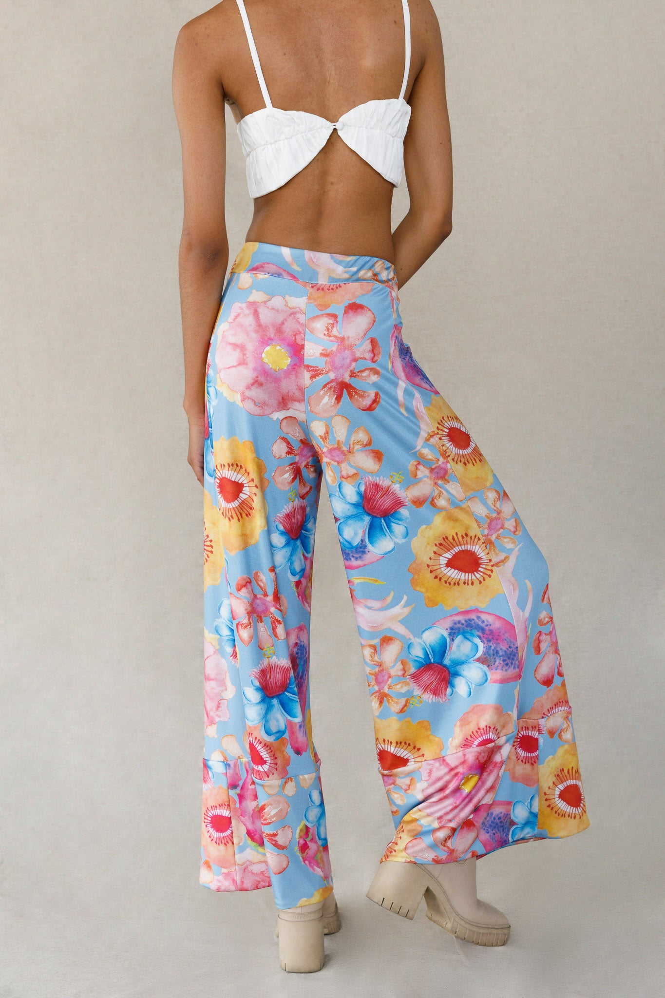 Taking cues from the 1970s, these wide-leg pants are designed to make your wardrobe pop. The vibrant florals are set on a sky-blue background, creating a joyful harmony guaranteed to lift your mood. The elastic waistband makes these relaxed-fit pants super comfortable as they drape beautifully to your body. Complete the look with our Clarita Reversible Jacket.